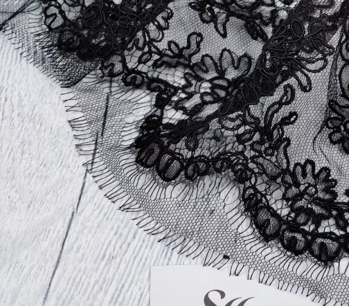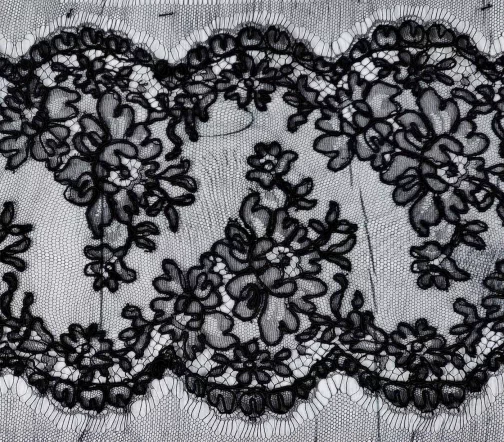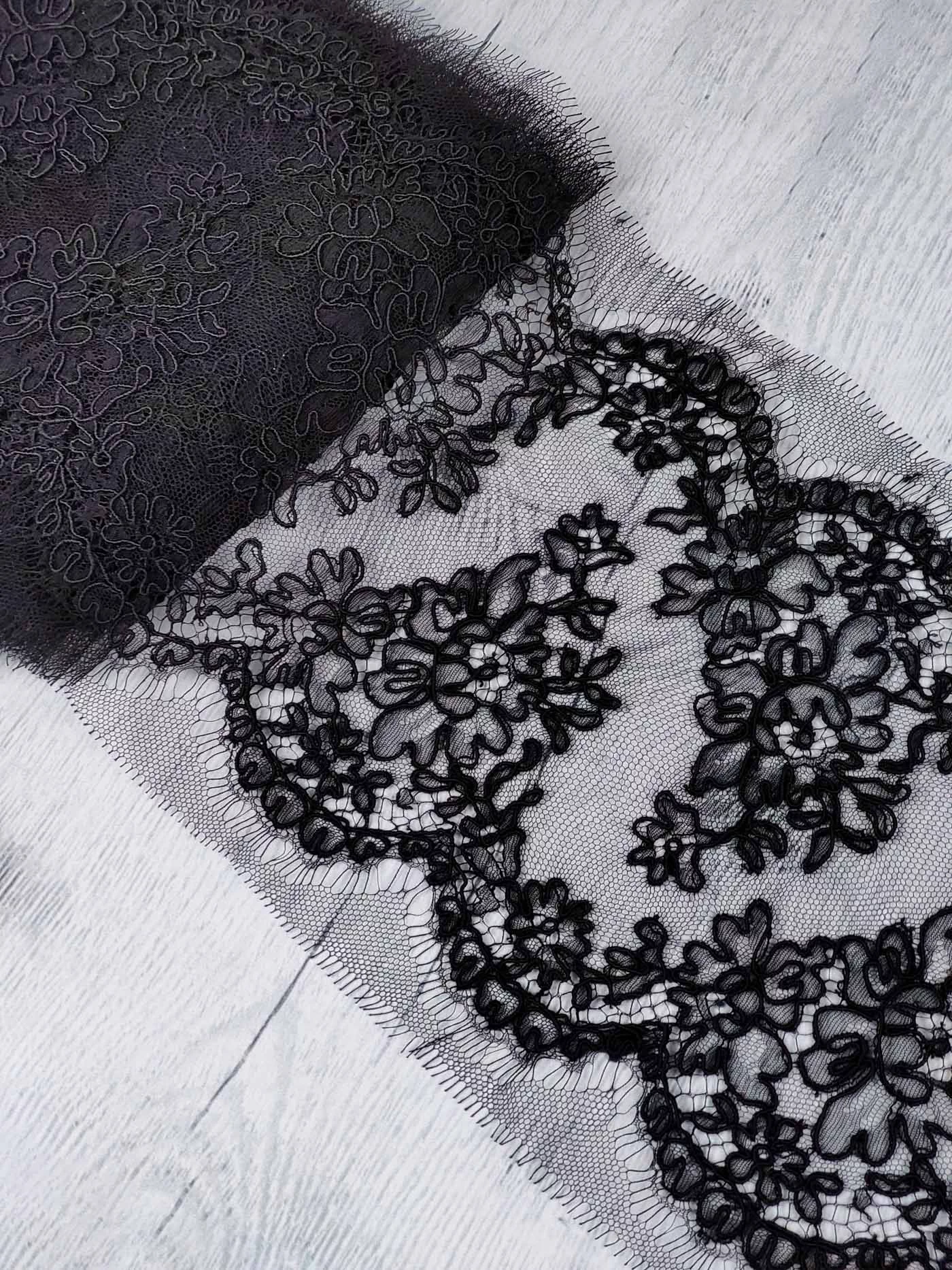 Кружево ручной работы, плетение гипюр шантильи, с обеих сторон фестончатый край, цветочно-геометрический орнамент. Узор выложен поверх объемной кордовой вискозной нитью. Прекрасно подойдет для отделки рукавов, кромки, горловины, области талии.