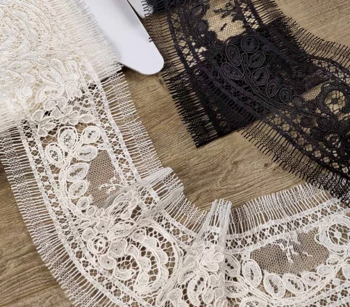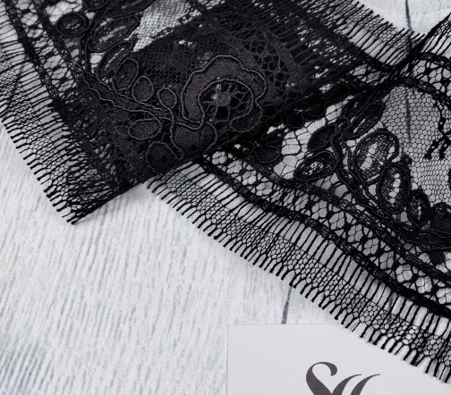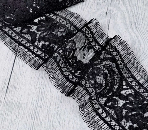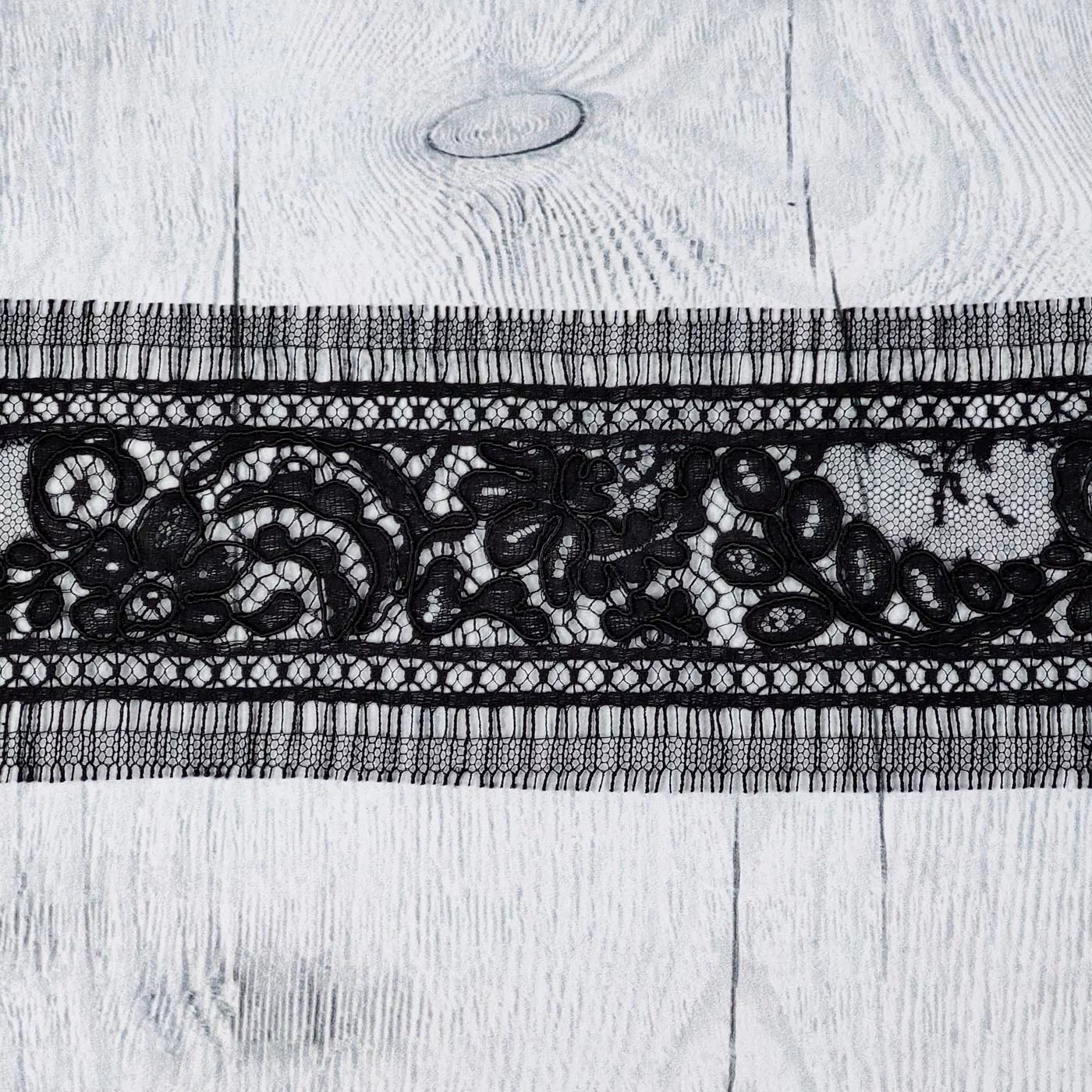 Кружево ручной работы, плетение гипюр шантильи, с обеих сторон фестончатый край, цветочно-геометрический орнамент. Узор выложен поверх объемной кордовой вискозной нитью. Прекрасно подойдет для отделки рукавов, кромки, горловины, области талии.