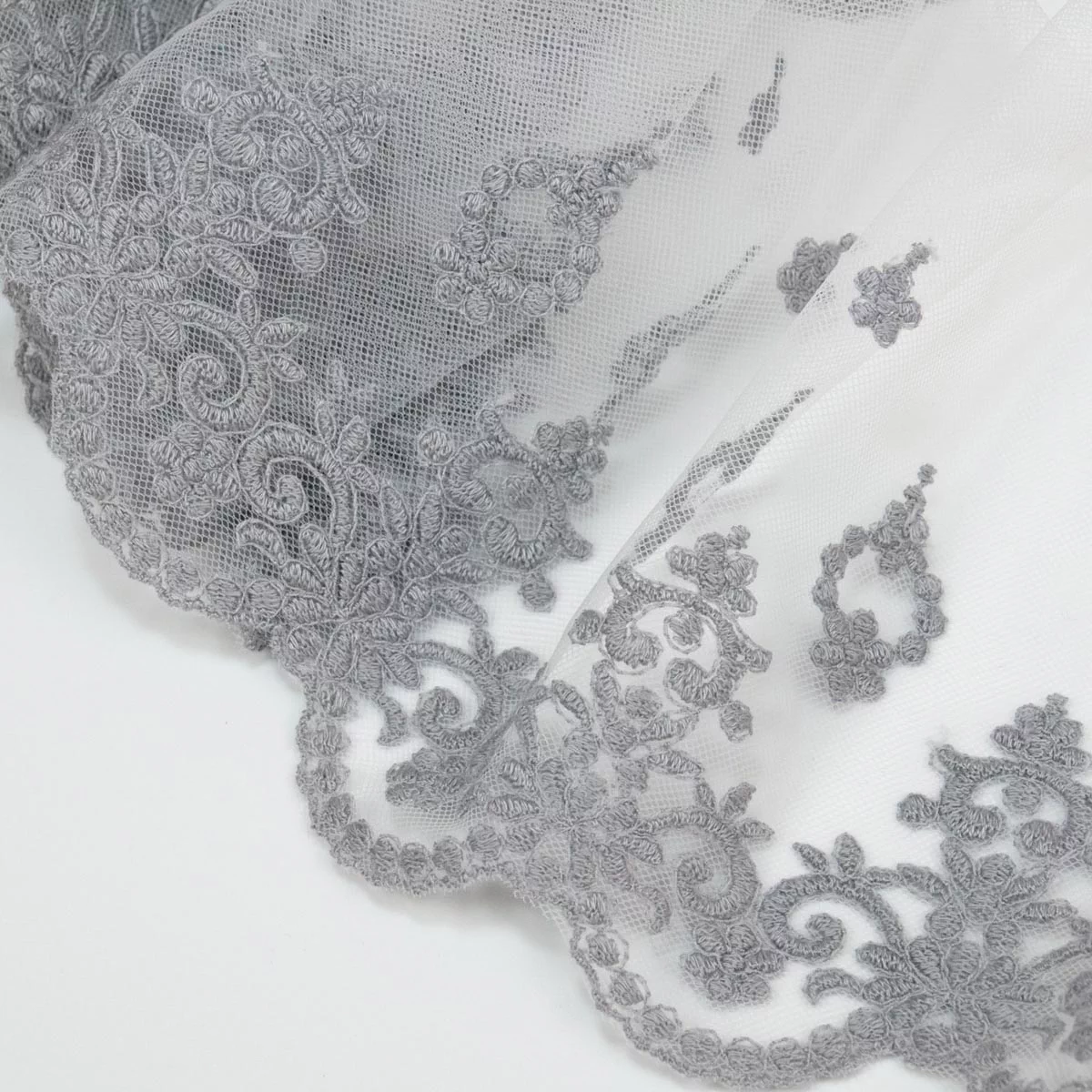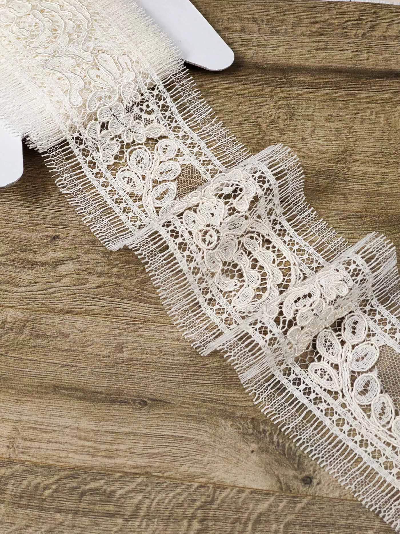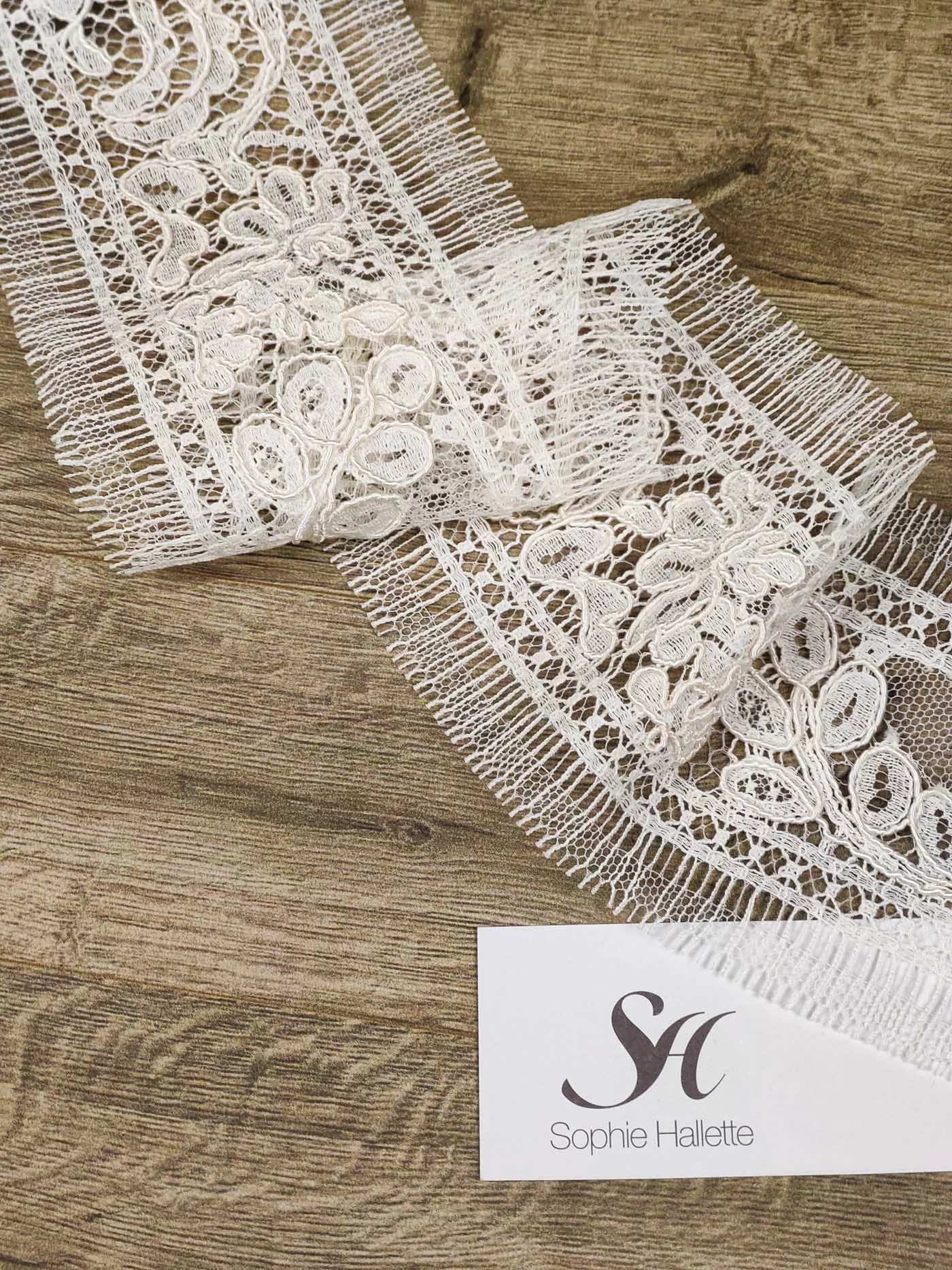 Кружево ручной работы, плетение гипюр шантильи, с обеих сторон фестончатый край, цветочно-геометрический орнамент. Узор выложен поверх объемной кордовой вискозной нитью. Прекрасно подойдет для отделки рукавов, кромки, горловины, области талии.
