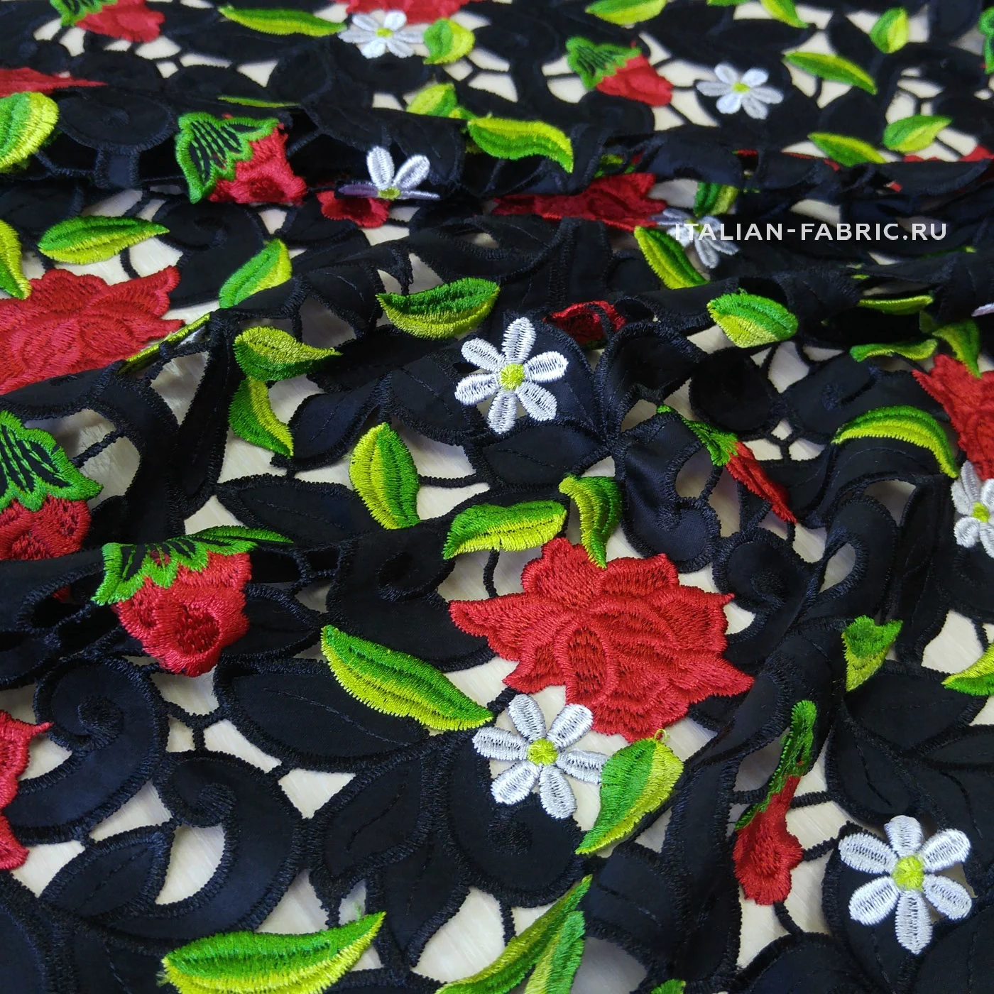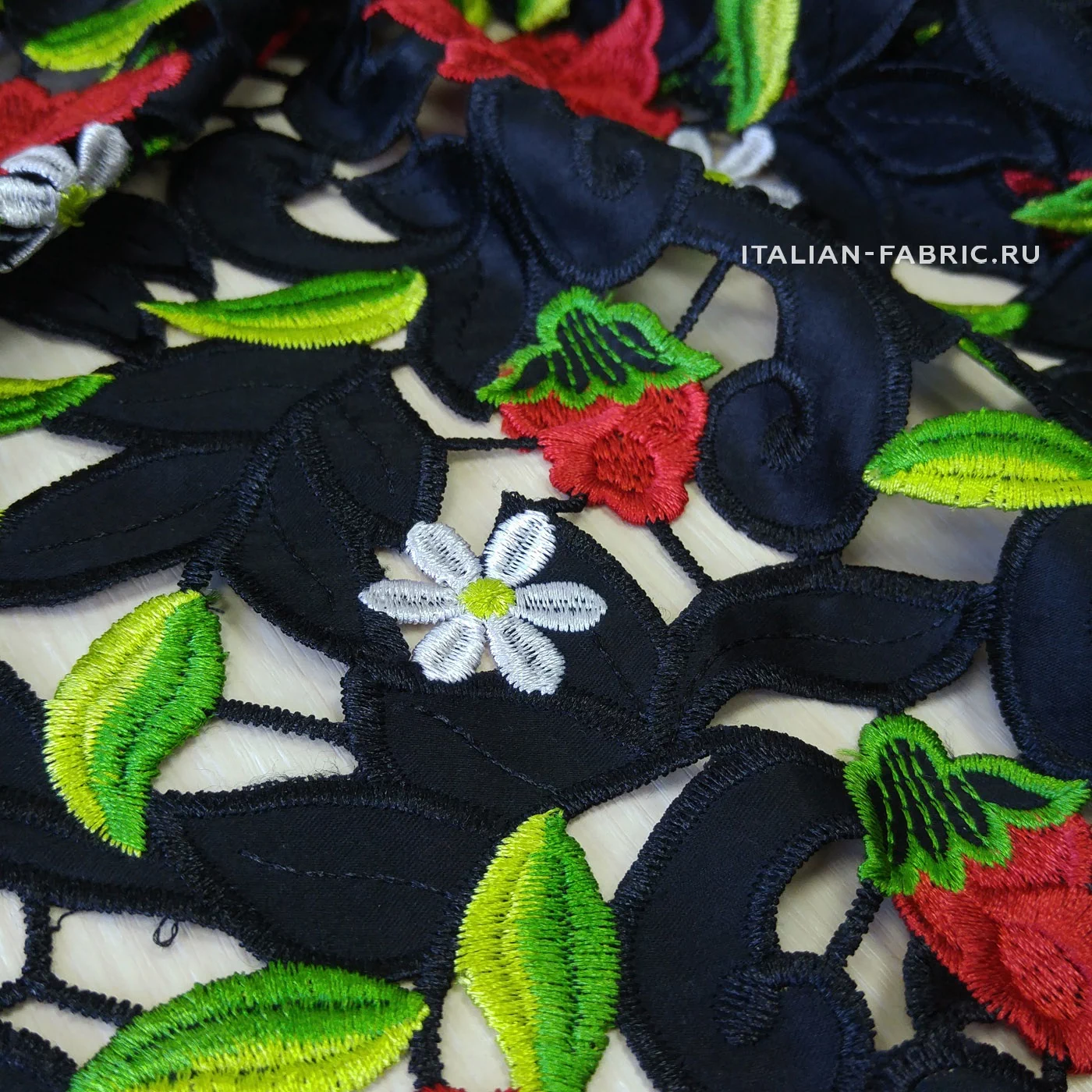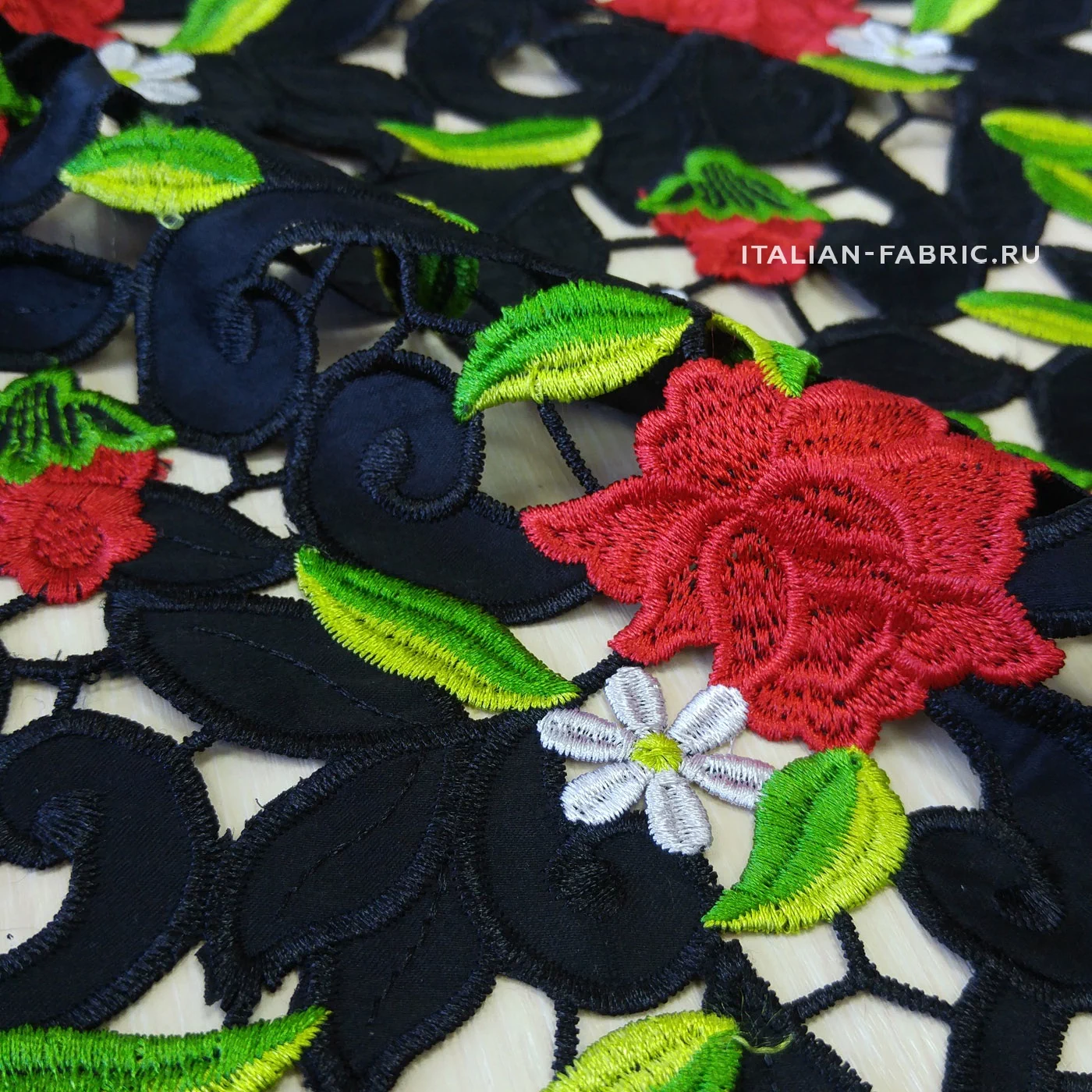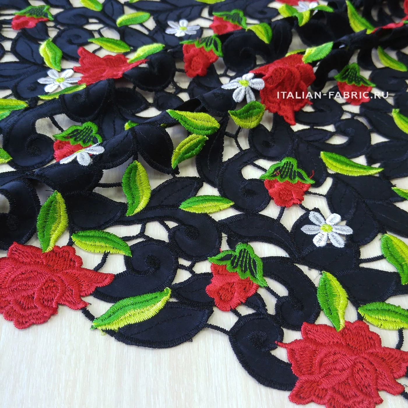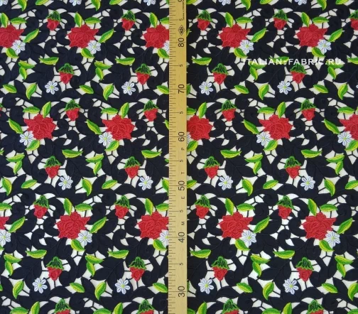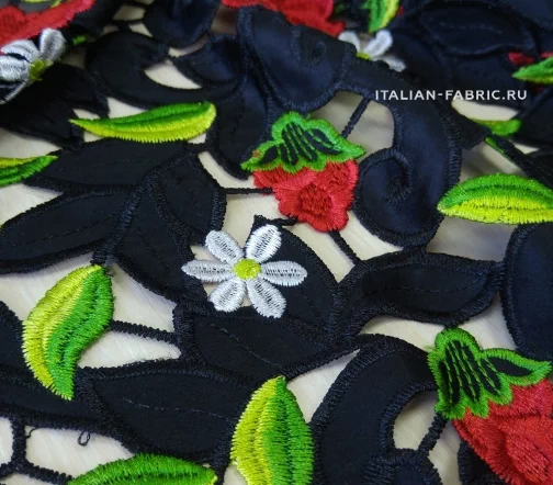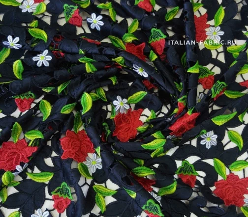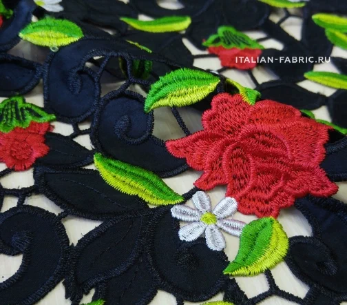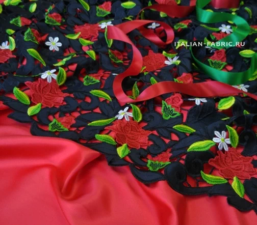 Обе кромки с фестончатым краем, прекрасно обработаны - можно использовать как край изделия. Хлопковая черная основа. Безупречного качества и изумительной красоты haute couture кружево со стилизованными цветущими красными розочками и ромашками. Имеет лёгкий элегантный блеск за счет вискозных нитей вышивки.