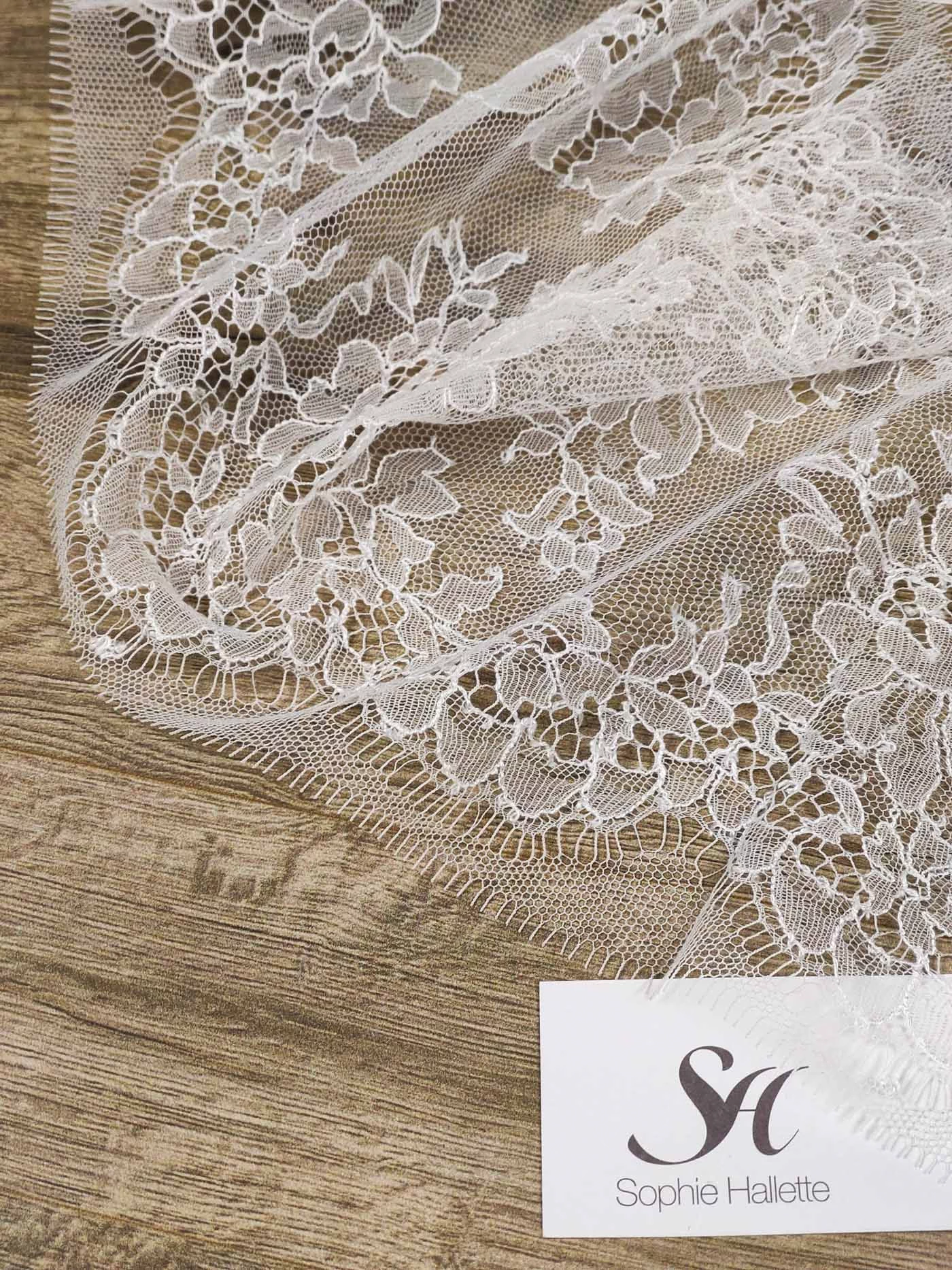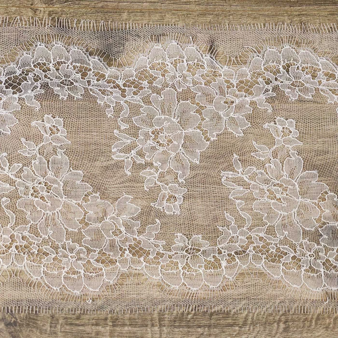 Вышивка выполнена матовыми полиэстеровыми нитями №110. Тюль-основа из 100% полиэстера белого цвета имеет запас на растяжимость, не дает стягивания швов, края не осыпаются. Применяется для отделки свадебных и нарядных женских платьев. Также применяется для отделки женских платьев, юбок и жакетов из легких и средней плотности тканей, например сукна и габардина; великолепно подходит для отделки женского белья и одежды из трикотажа; изысканно смотрится как отделка вязаных изделий. Кружево на тюле мягкое, удобно в носке и легкое в уходе, не мнется.