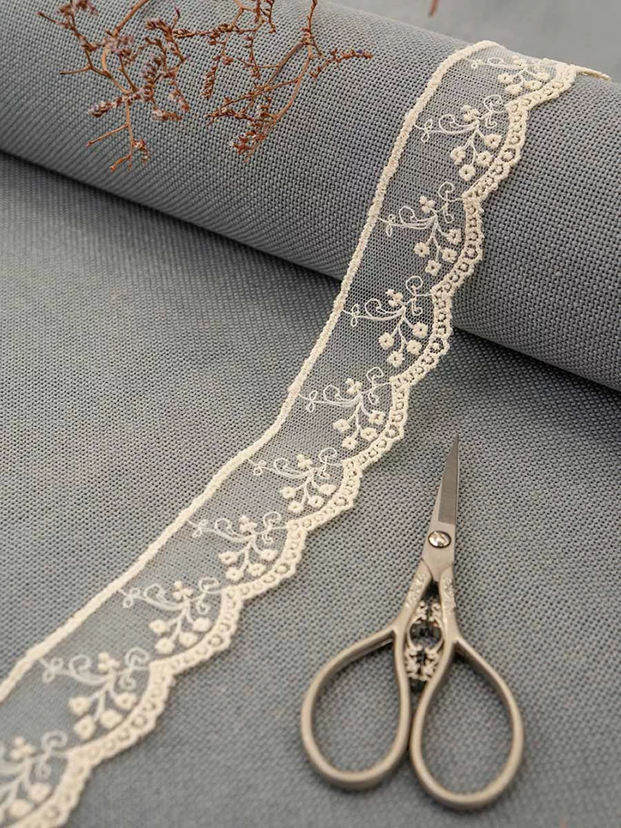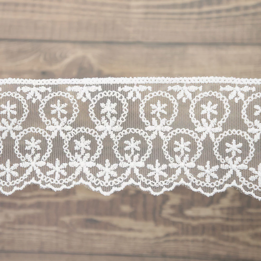 Вышивка выполнена матовыми полиэстеровыми нитями №110. Тюль-основа из 100% полиэстера белого цвета имеет запас на растяжимость, не дает стягивания швов, края не осыпаются. Применяется для отделки свадебных и нарядных женских платьев. Также применяется для отделки женских платьев, юбок и жакетов из легких и средней плотности тканей, например сукна и габардина; великолепно подходит для отделки женского белья и одежды из трикотажа; изысканно смотрится как отделка вязаных изделий. Кружево на тюле мягкое, удобно в носке и легкое в уходе, не мнется.