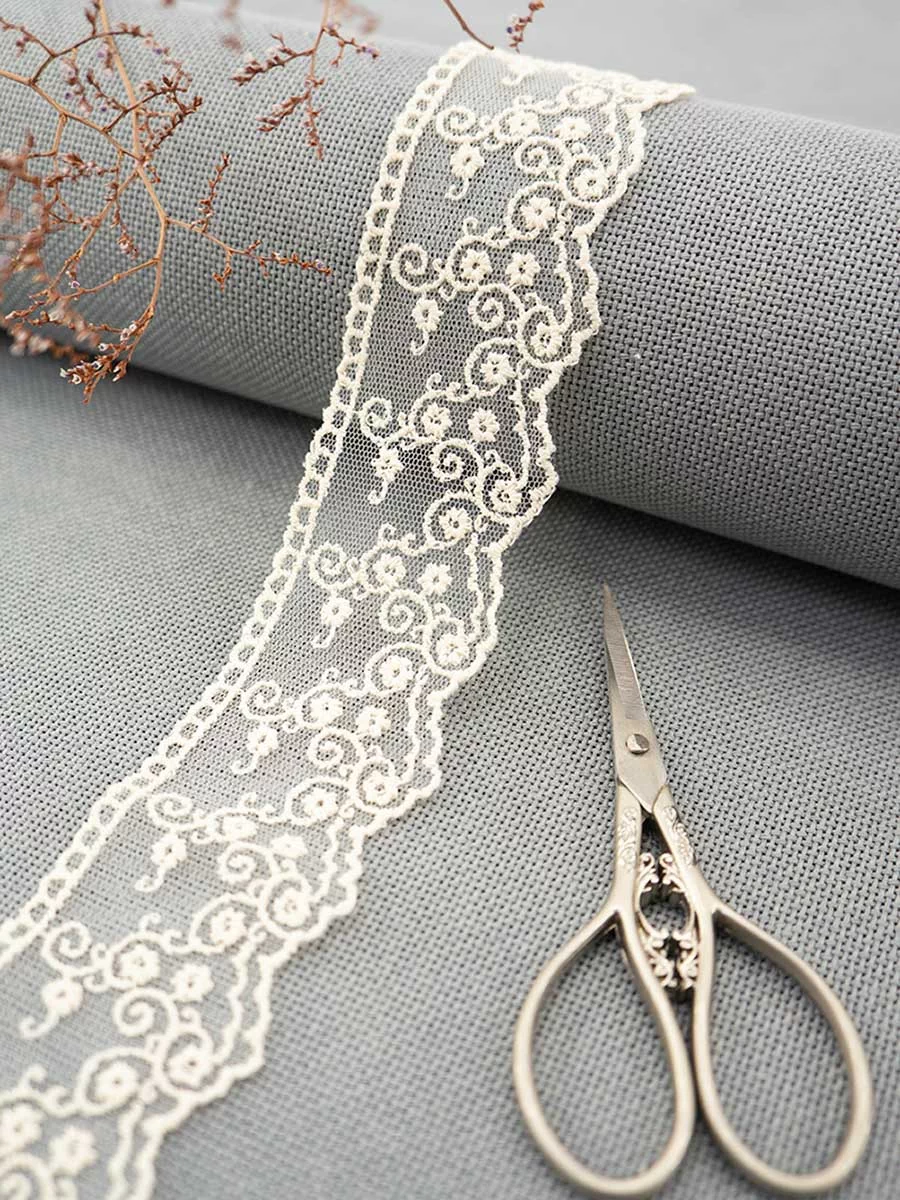 Вышивка выполнена матовыми полиэстеровыми нитями №110. Тюль-основа из 100% полиэстера белого цвета имеет запас на растяжимость, не дает стягивания швов, края не осыпаются. Применяется для отделки свадебных и нарядных женских платьев. Также применяется для отделки женских платьев, юбок и жакетов из легких и средней плотности тканей, например сукна и габардина; великолепно подходит для отделки женского белья и одежды из трикотажа; изысканно смотрится как отделка вязаных изделий. Кружево на тюле мягкое, удобно в носке и легкое в уходе, не мнется.