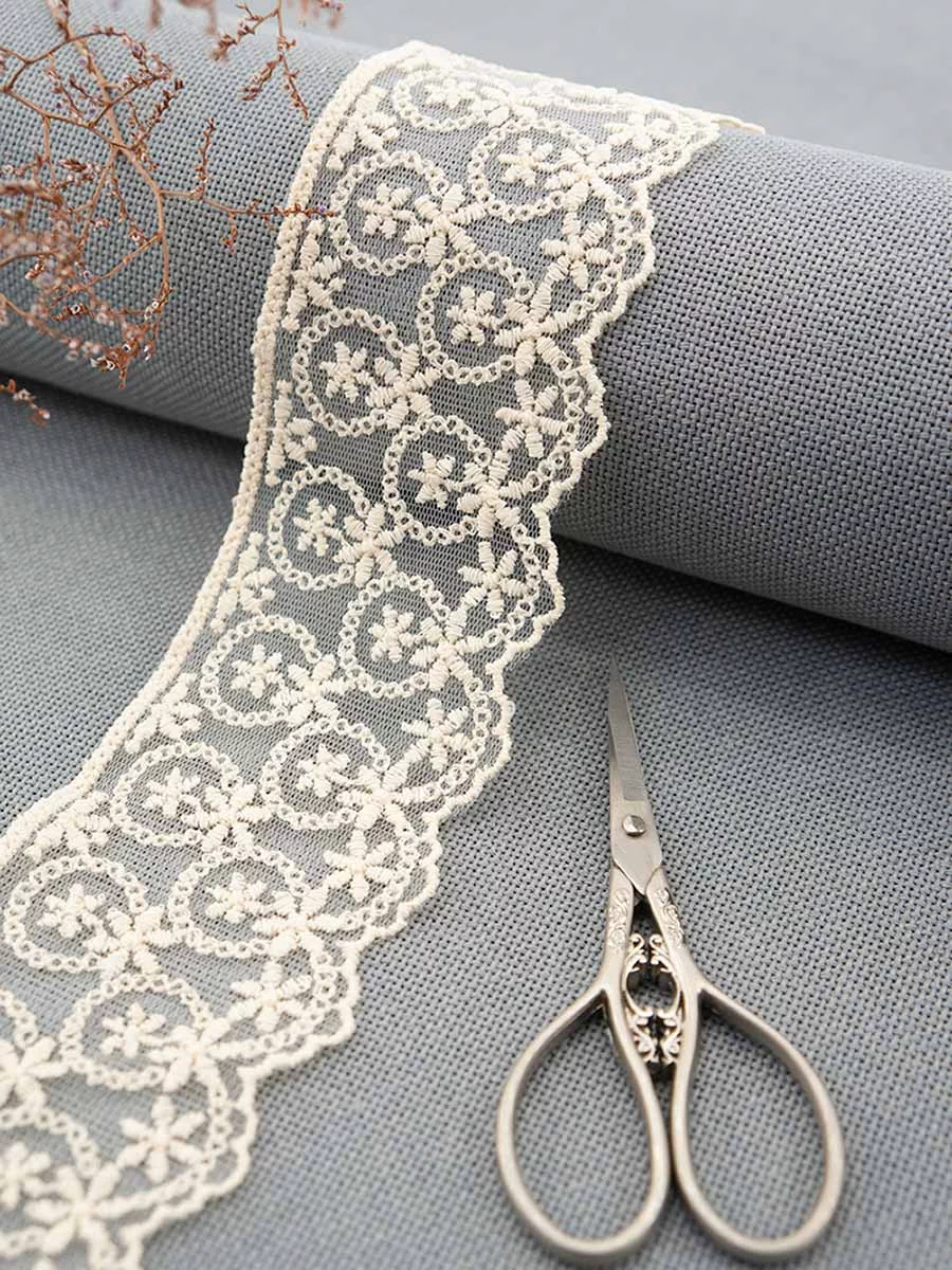 Вышивка выполнена матовыми полиэстеровыми нитями №110. Тюль-основа из 100% полиэстера белого цвета имеет запас на растяжимость, не дает стягивания швов, края не осыпаются. Применяется для отделки свадебных и нарядных женских платьев. Также применяется для отделки женских платьев, юбок и жакетов из легких и средней плотности тканей, например сукна и габардина; великолепно подходит для отделки женского белья и одежды из трикотажа; изысканно смотрится как отделка вязаных изделий. Кружево на тюле мягкое, удобно в носке и легкое в уходе, не мнется.