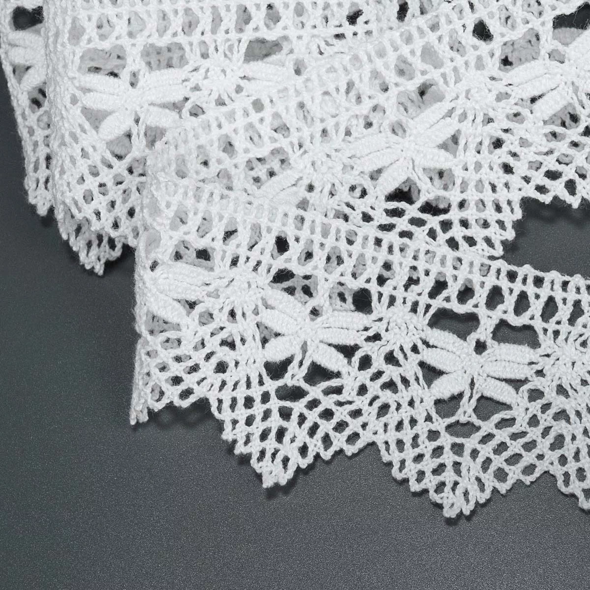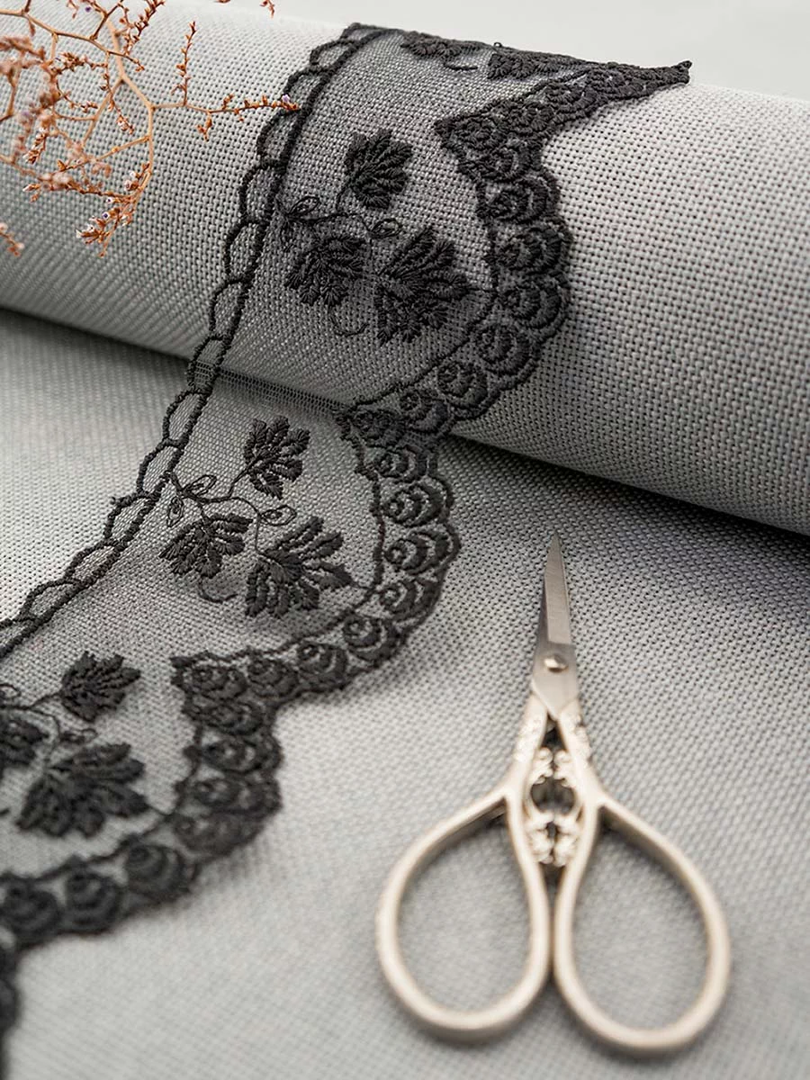 Вышивка выполнена матовыми полиэстеровыми нитями №110. Тюль-основа из 100% полиэстера белого цвета имеет запас на растяжимость, не дает стягивания швов, края не осыпаются. Применяется для отделки свадебных и нарядных женских платьев. Также применяется для отделки женских платьев, юбок и жакетов из легких и средней плотности тканей, например сукна и габардина; великолепно подходит для отделки женского белья и одежды из трикотажа; изысканно смотрится как отделка вязаных изделий. Кружево на тюле мягкое, удобно в носке и легкое в уходе, не мнется.