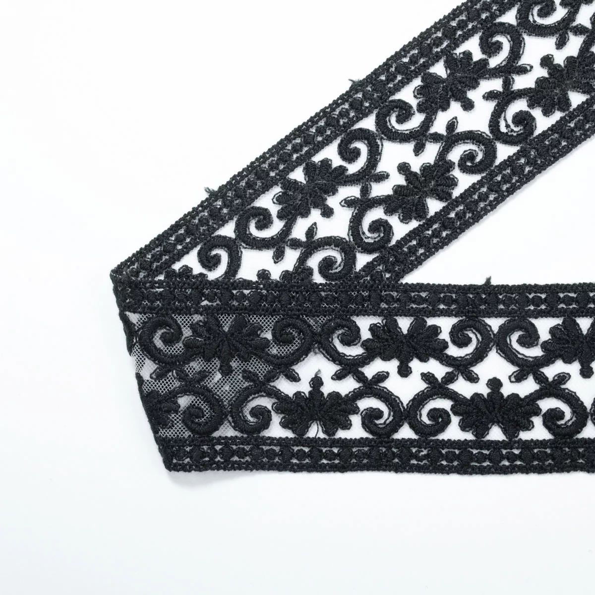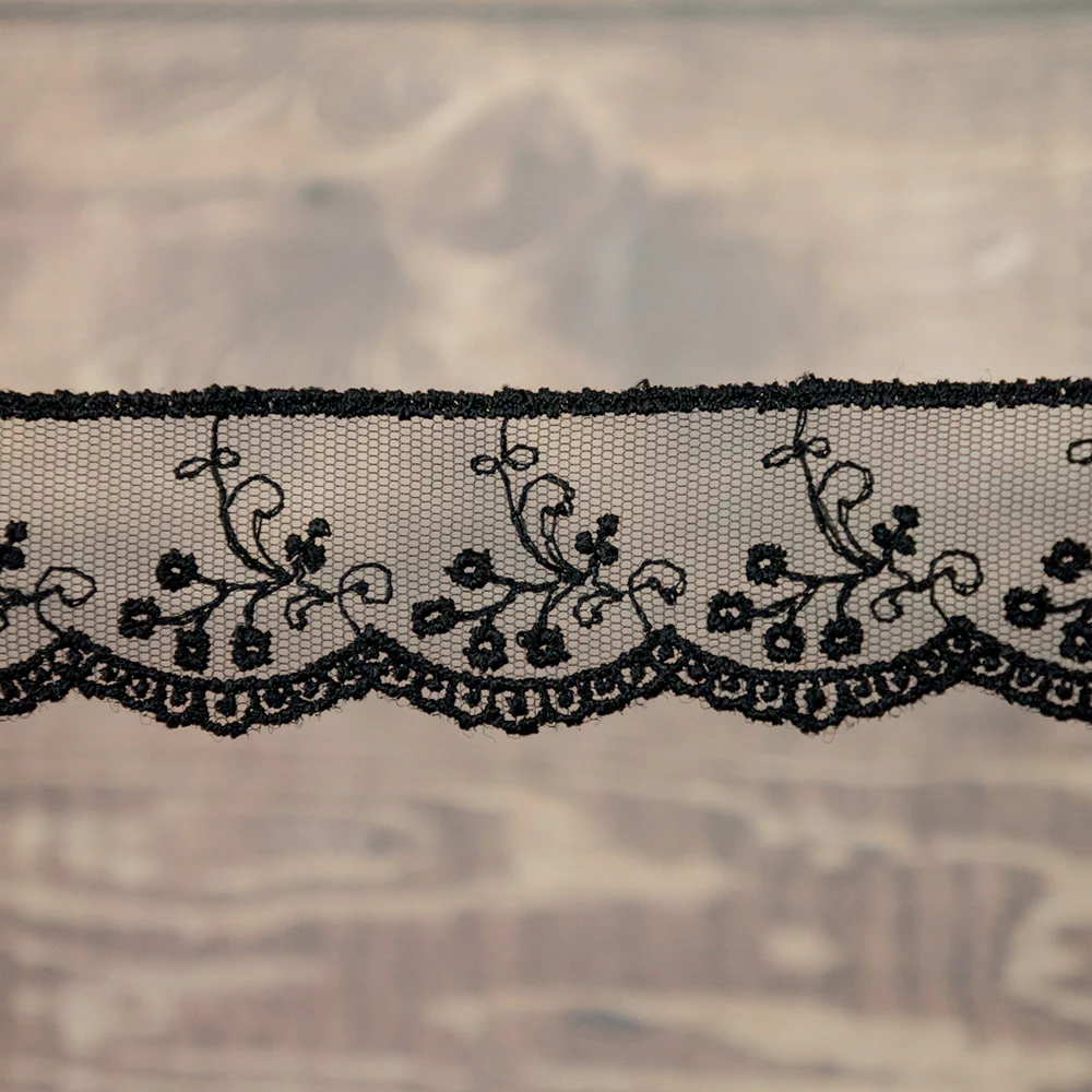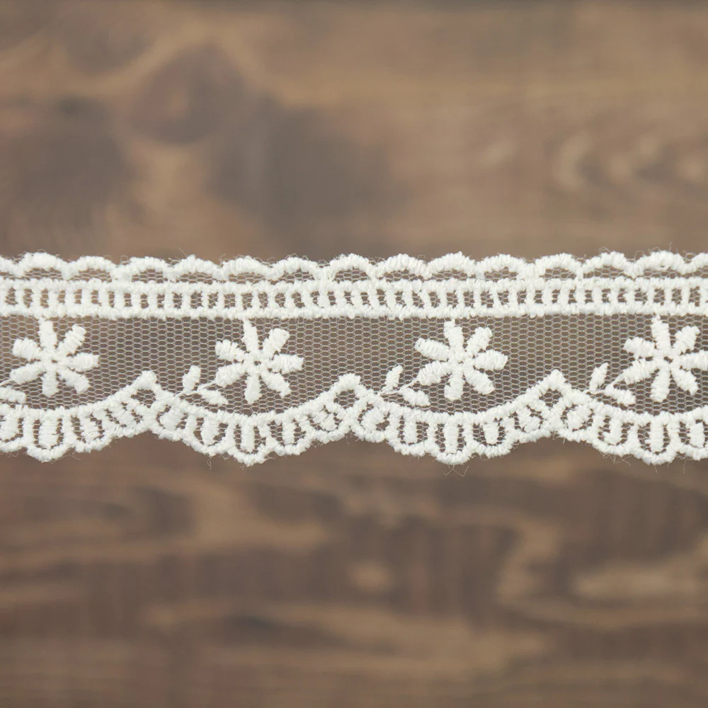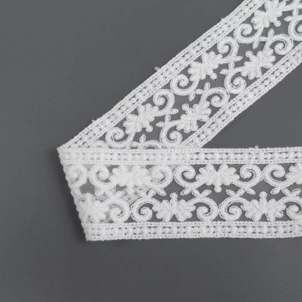 Вышивка выполнена матовыми полиэстеровыми нитями №110. Тюль-основа из 100% полиэстера белого цвета имеет запас на растяжимость, не дает стягивания швов, края не осыпаются. Применяется для отделки свадебных и нарядных женских платьев. Также применяется для отделки женских платьев, юбок и жакетов из легких и средней плотности тканей, например сукна и габардина; великолепно подходит для отделки женского белья и одежды из трикотажа; изысканно смотрится как отделка вязаных изделий. Кружево на тюле мягкое, удобно в носке и легкое в уходе, не мнется.