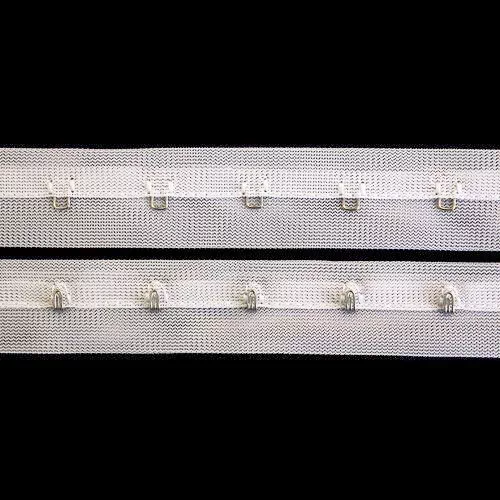 Тесьма с крючками и петлями представляет собой однорядную застежку на мягкой ленте. Используется при пошиве нижнего женского белья, корсетов, корсажных платьев, оригинальной одежды. Крючки предназначены для создания потайной застежки, которая не должна быть видна с лицевой стороны изделия. Тесьма удобна для вшивания в изделия, не деформируется, что поможет продлить срок службы вашего изделия. Ширина тесьмы 25 мм, расстояние между крючками 25 мм.