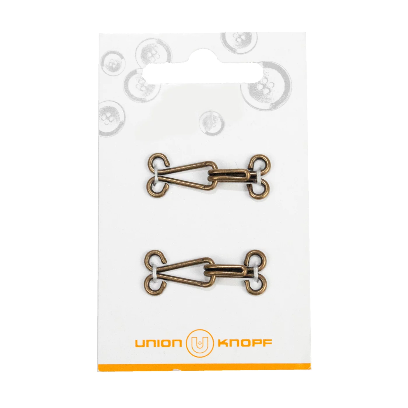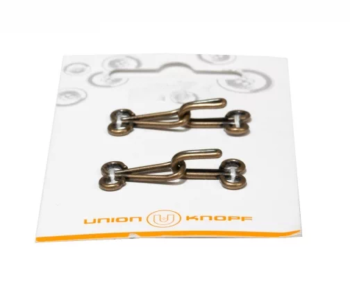 Металлические пришивные крючки - это потайная застежка, которая состоит из 2-х деталей, где одна является петлей, другая крючком. В зависимости от размеров крючки и петли делят на области применения: пальтовые, плащевые, для женского и детского платья, для женского белья. Крючки пришивные обеспечивают прочное соединение деталей изделия. Благодаря боковым ушкам могут быть легко вшиты в одежду. Застежка произведена из качественного сплава металлов, имеет полуматовую поверхность. Покрытие устойчиво к коррозии.