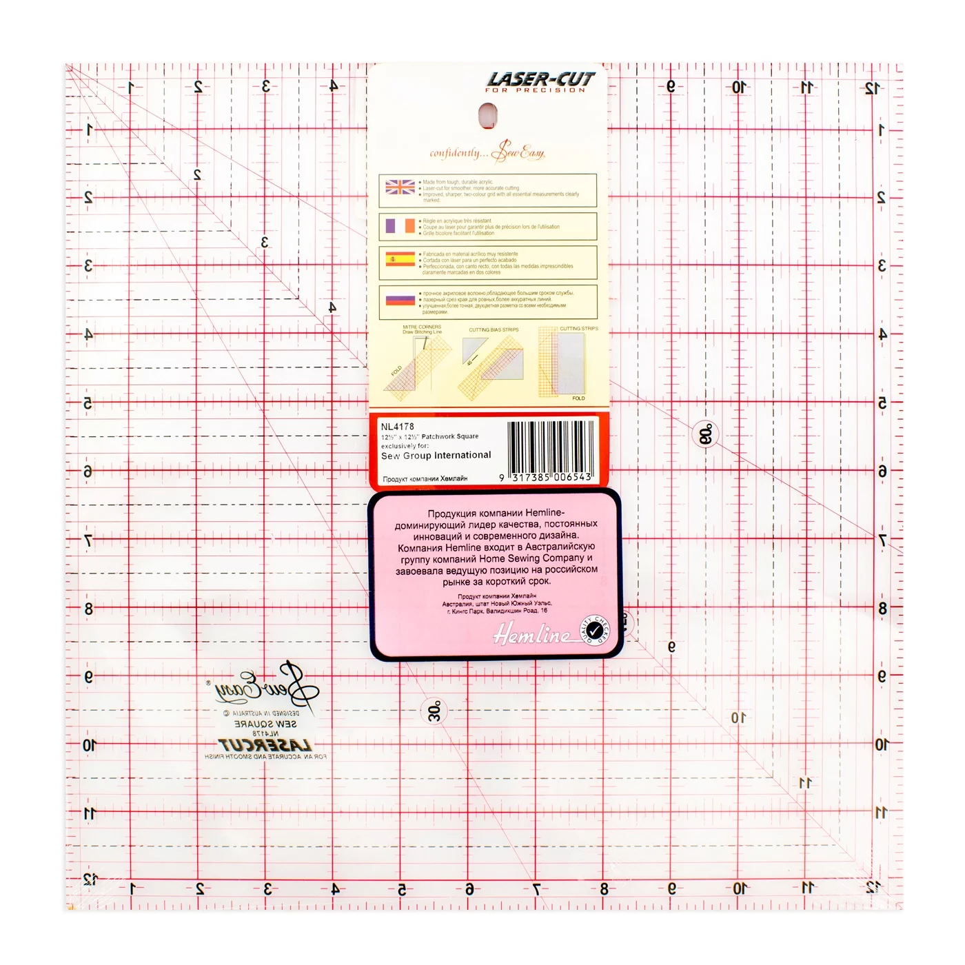 NL4178 Линейка для пэчворка, градация в дюймах, квадрат 12 1/2", Hemline