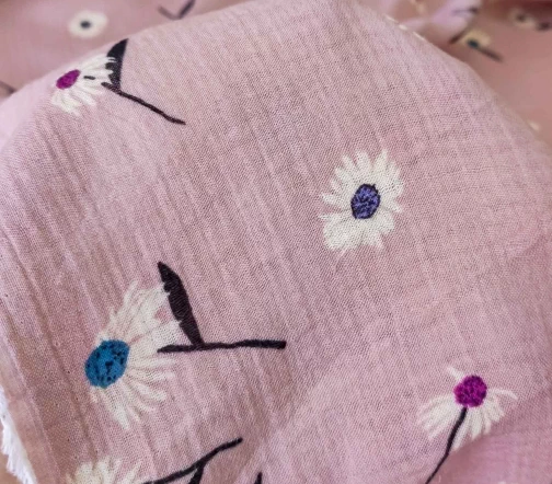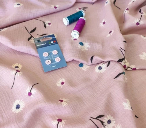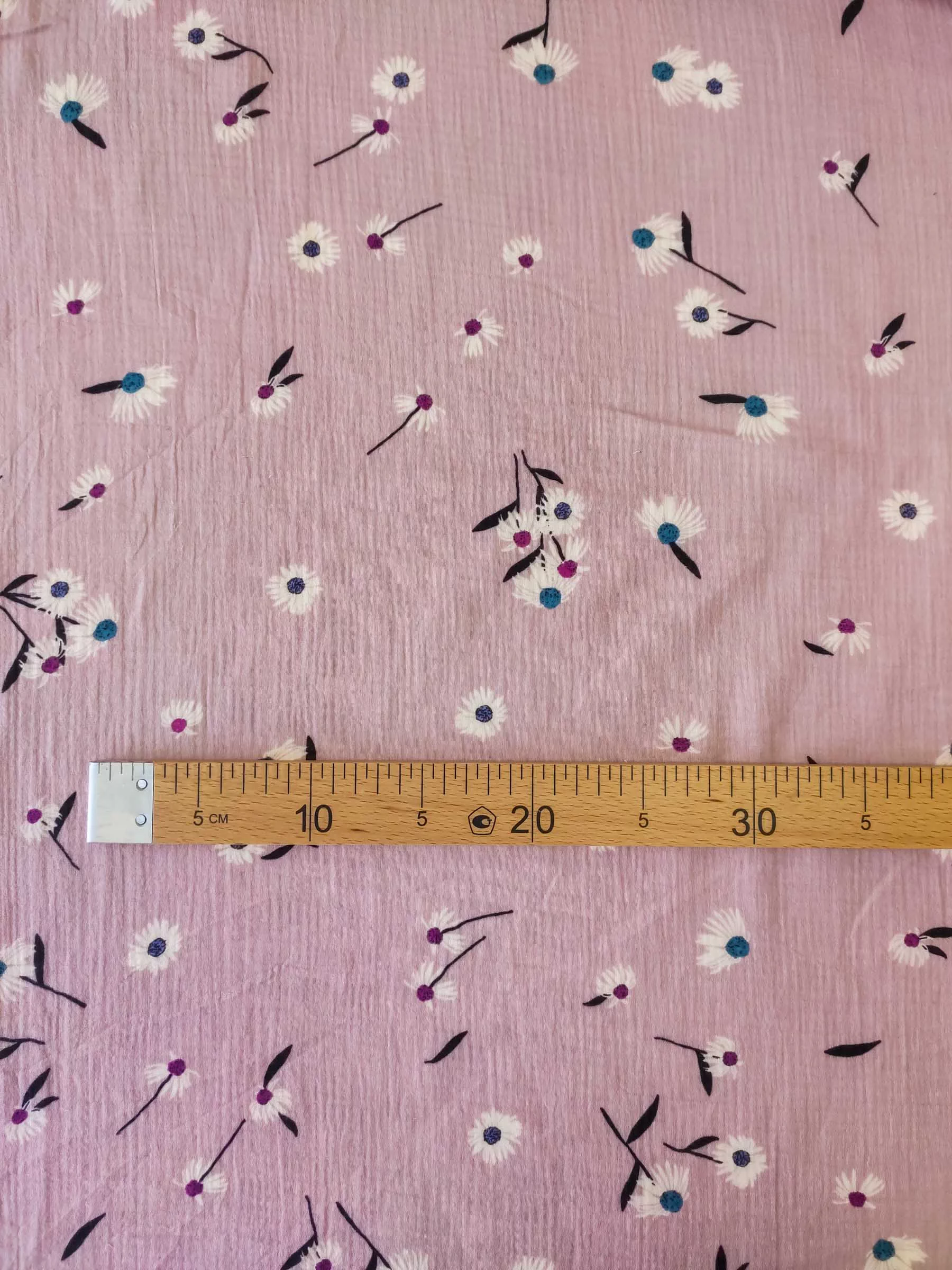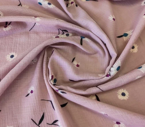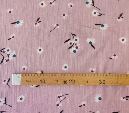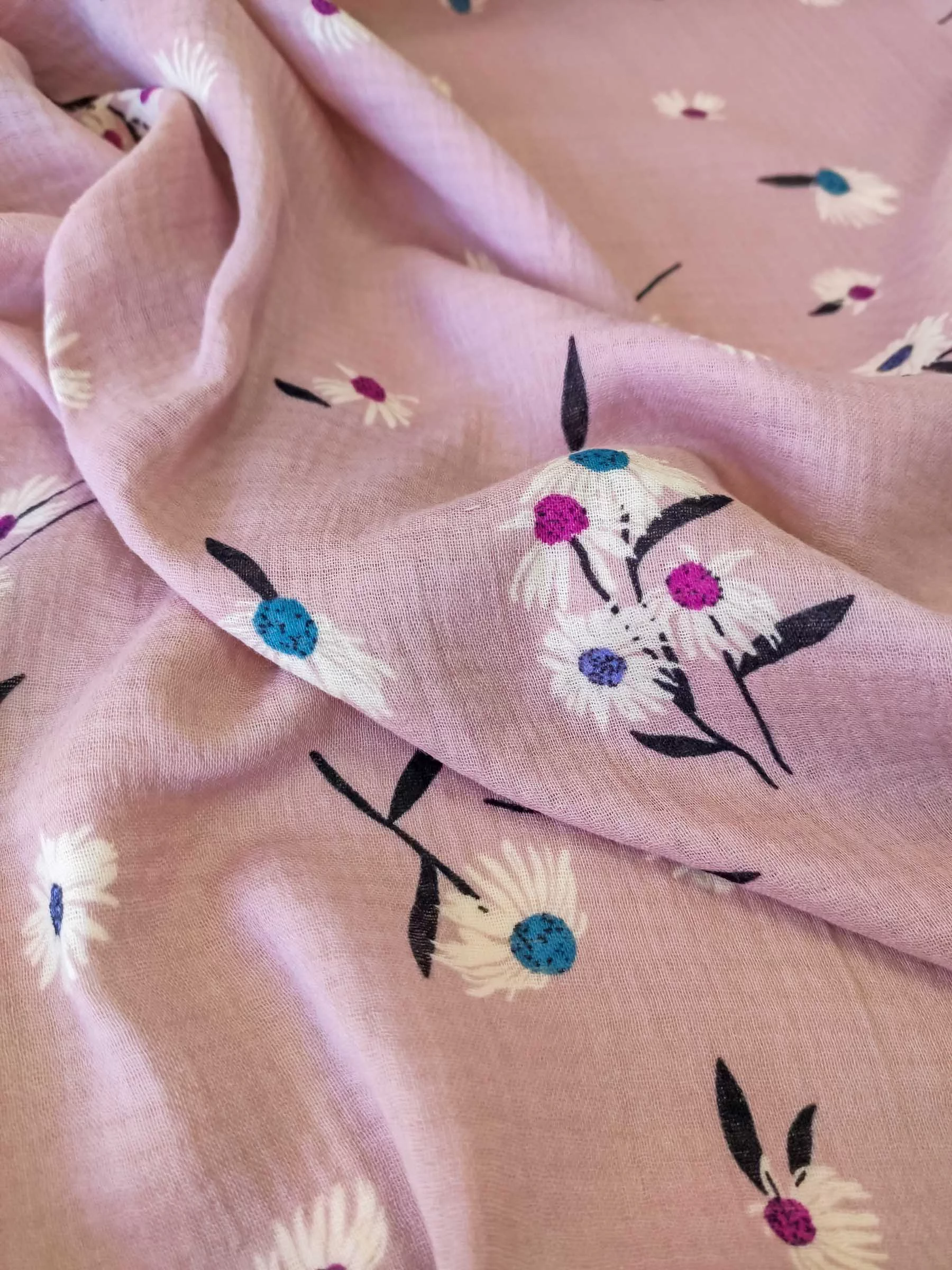 Прекрасные ромашки на розово-сиреневом, не «кричящем» фоне, с сиреневой ноткой. Лёгкая, мягкая ткань, немного тянется за счет структуры, будет очень комфортна в носке. Идеально подойдёт на платье, комбинезон, блузу, юбку.