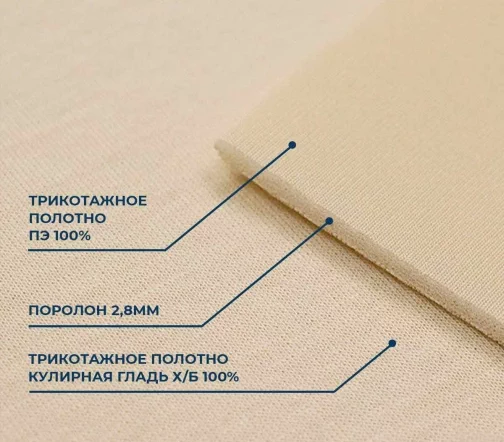 Состав: внутренний слой: 100% вспененный полиуретан толщиной 2,5+/-10% мм; лицевой слой: 100% полиэстер, изнаночный слой: 100% хлопок.