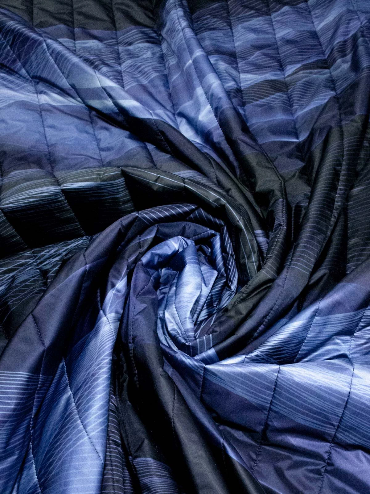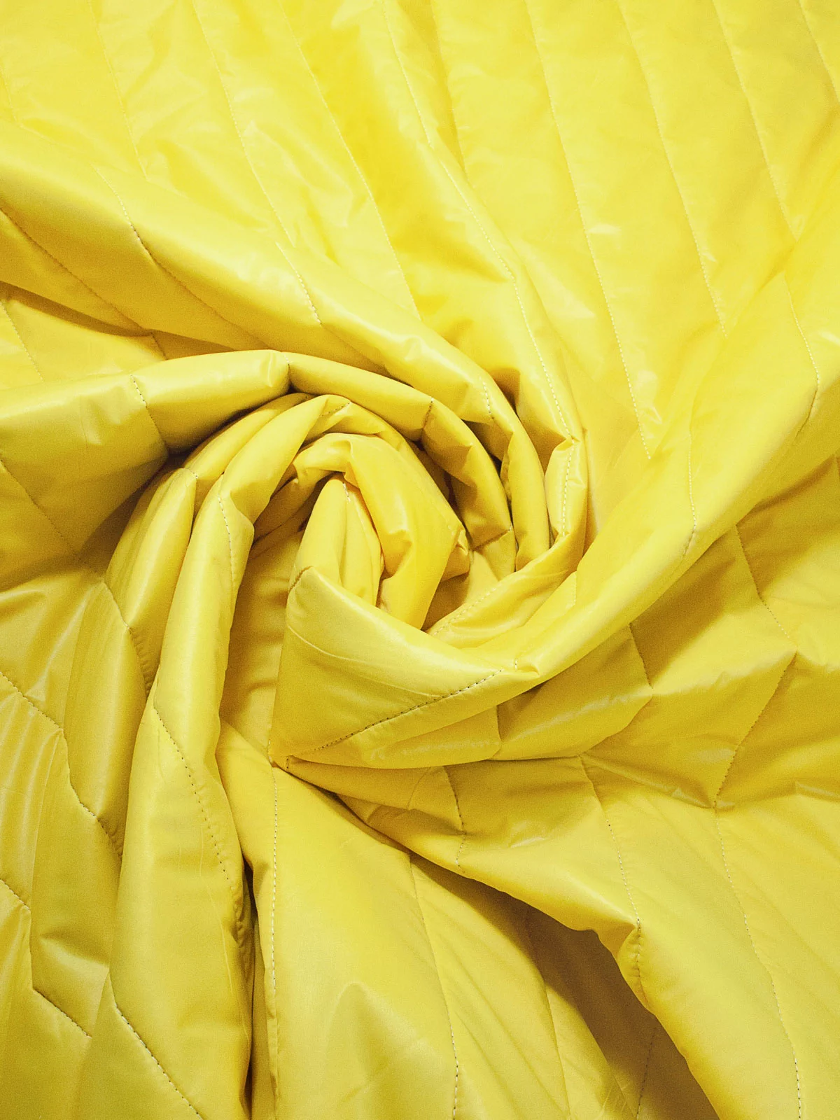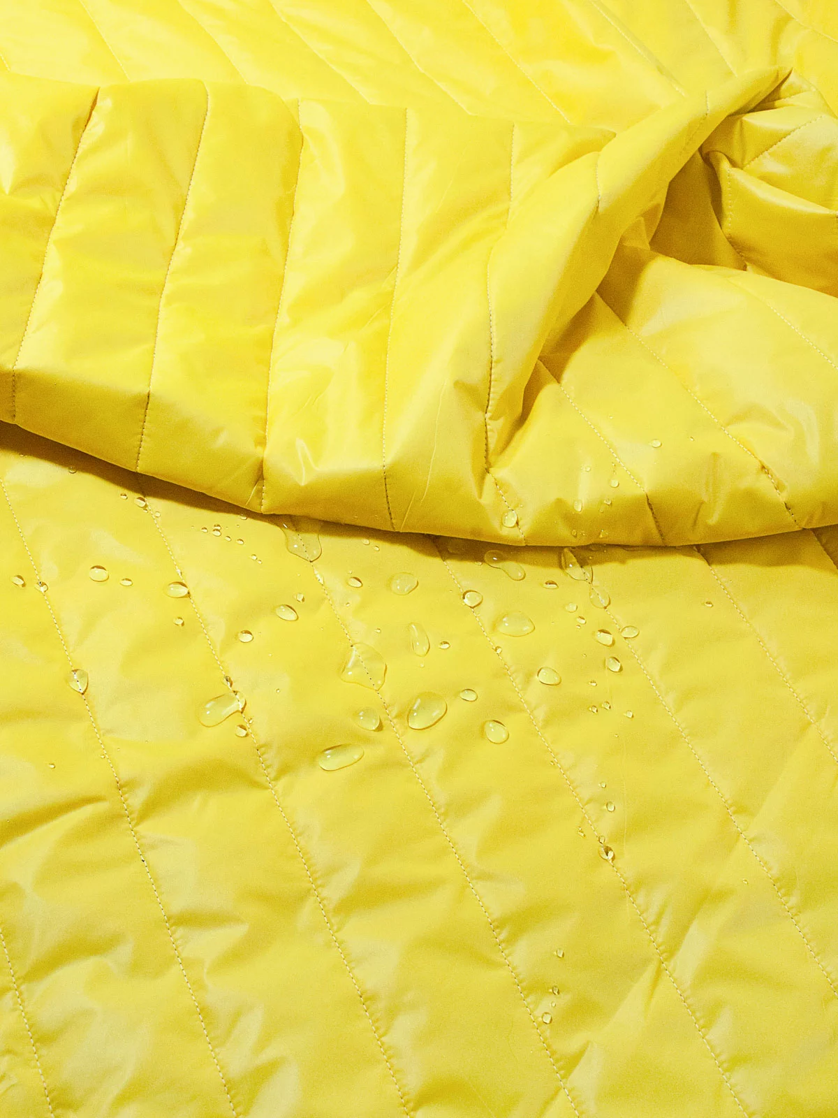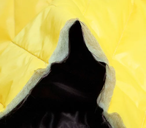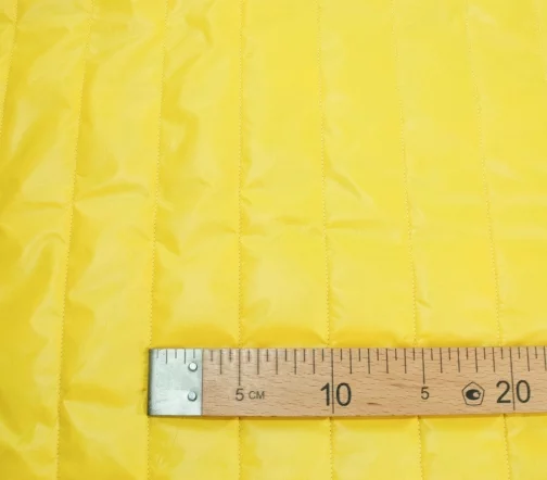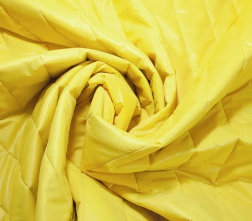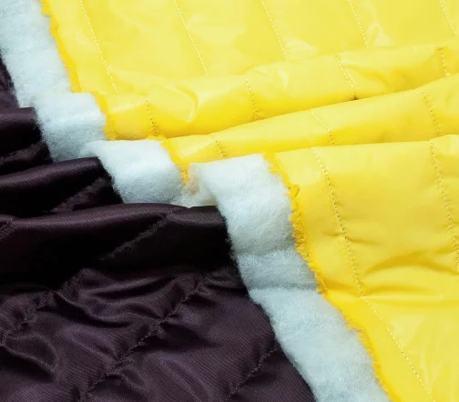 Стеганая трехслойная курточная ткань на синтепоне и подкладке. С лицевой стороны прочная ткань желтого цвета, с изнаночной - подкладочная ткань вискоза темно-фиолетового цвета.