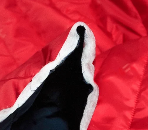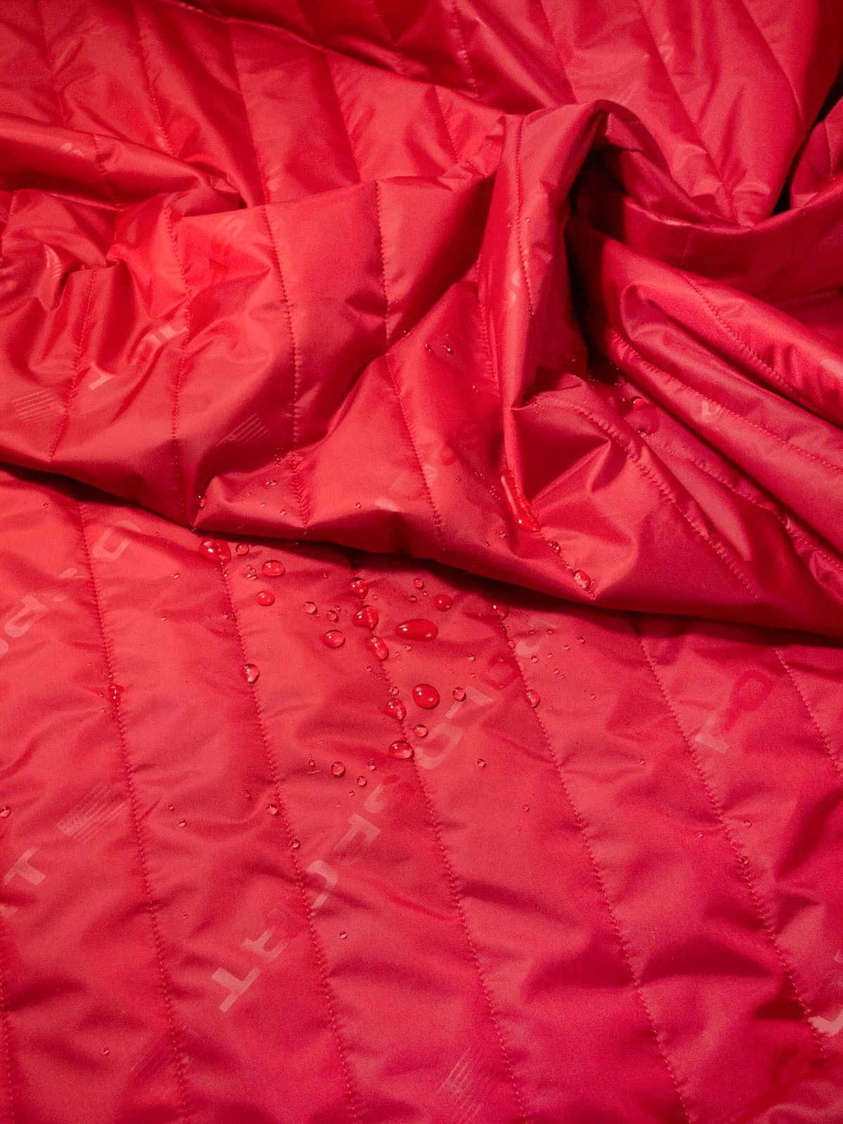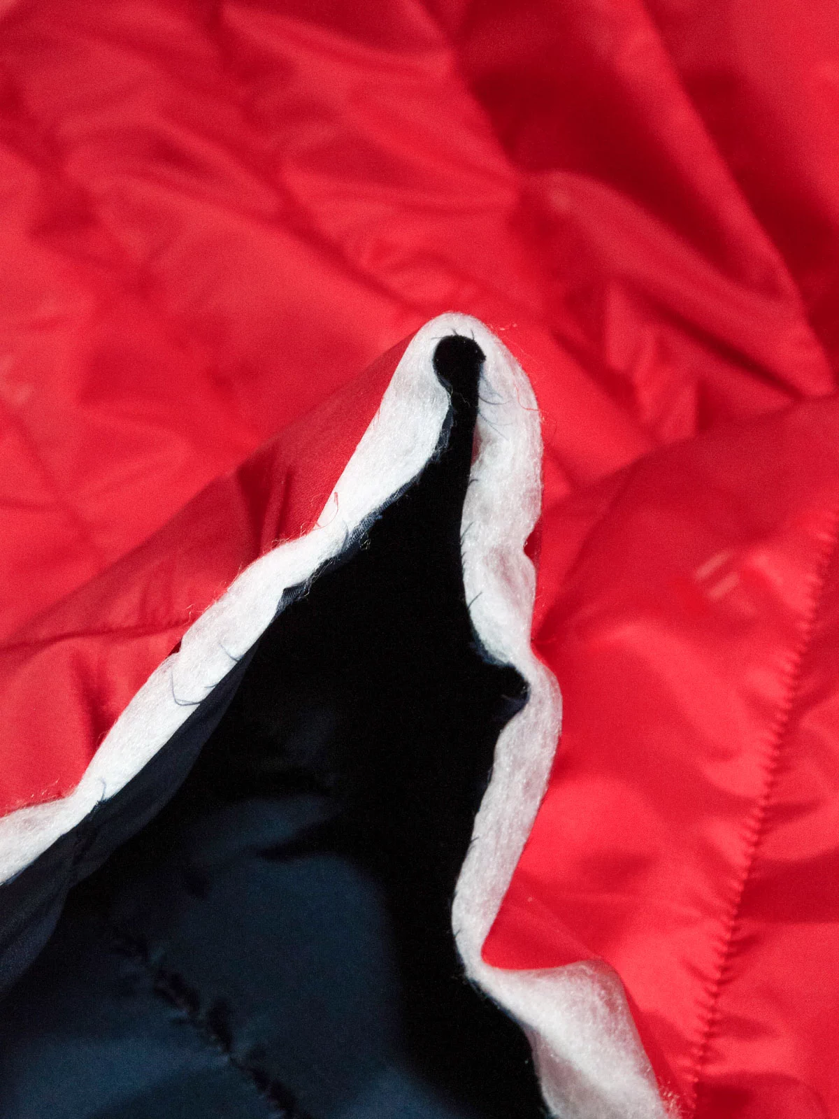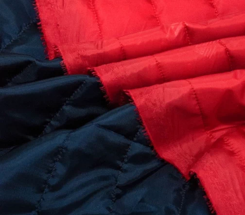 Стеганая трехслойная курточная ткань на синтепоне и подкладке. С лицевой стороны прочная ткань алого цвета с надписями, с изнаночной - подкладочная ткань вискоза темно-синего цвета.