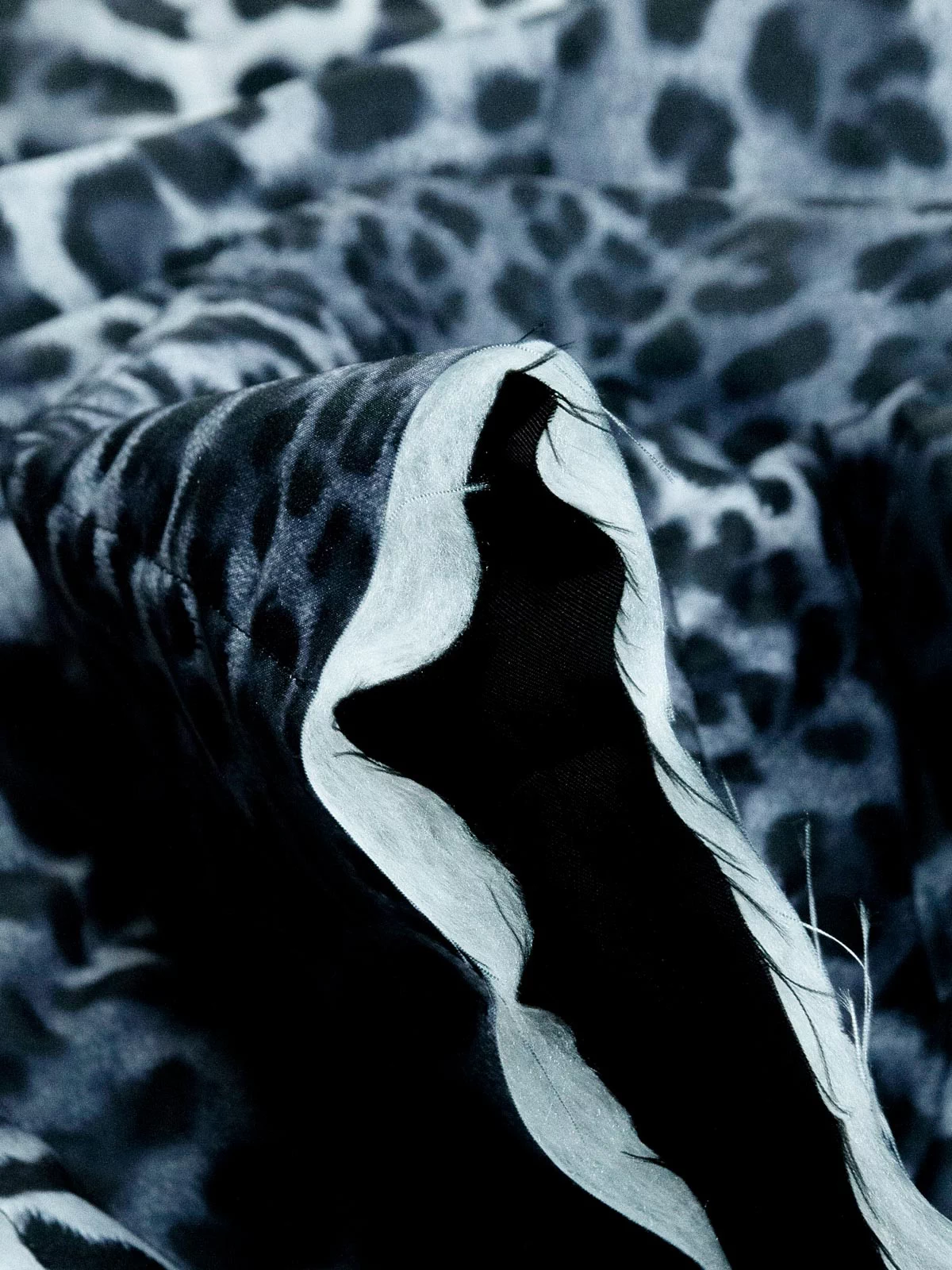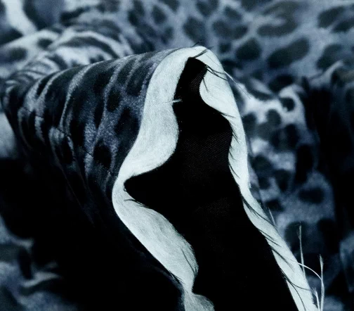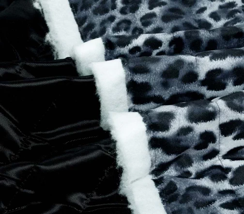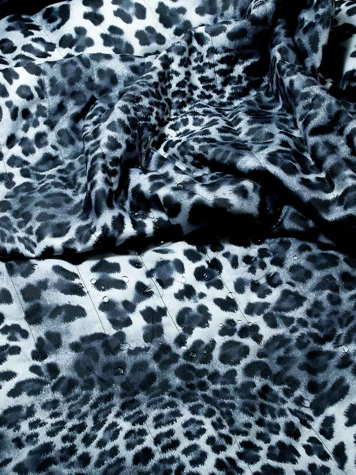 Стеганая трехслойная курточная ткань на синтепоне и подкладке. С лицевой стороны прочная матовая ткань с анималистичным рисунком - леопардовыми пятнами в сине-серых оттенках, с изнаночной - подкладочная ткань вискоза черного цвета. Стежка параллельно кромке. Ширина стежки 5,0см.