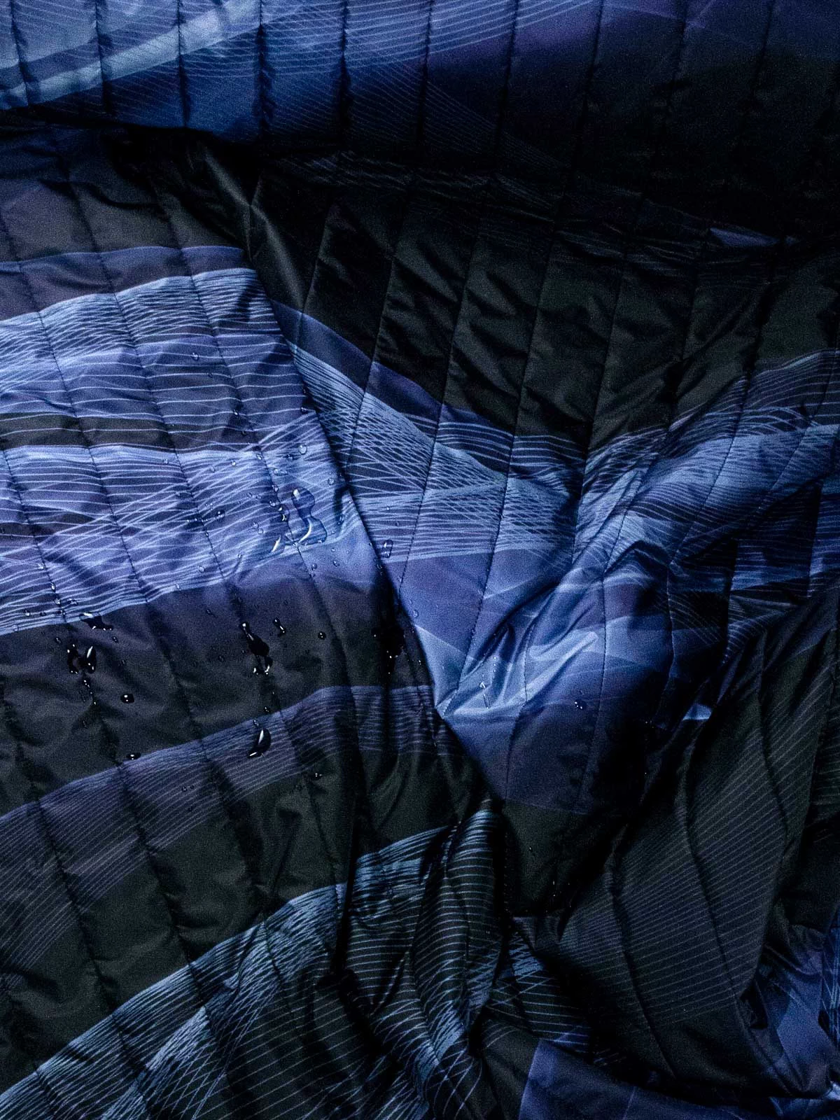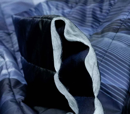 Материал шуршащий, легкий, несмотря на многослойность. Вода легко скатывается с поверхности, строчка стежки также загерметизирована. Превосходное качество!