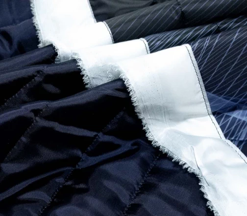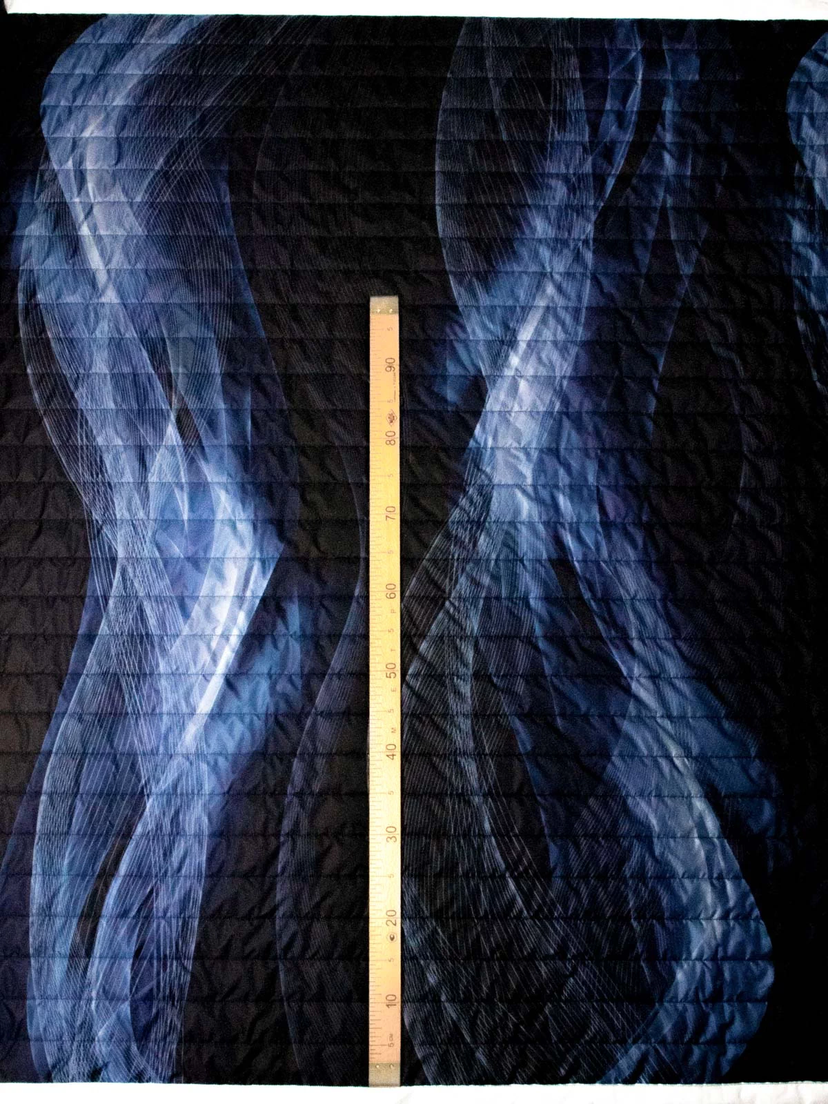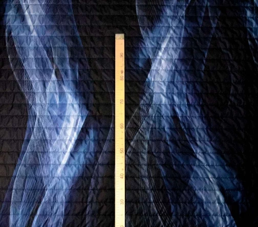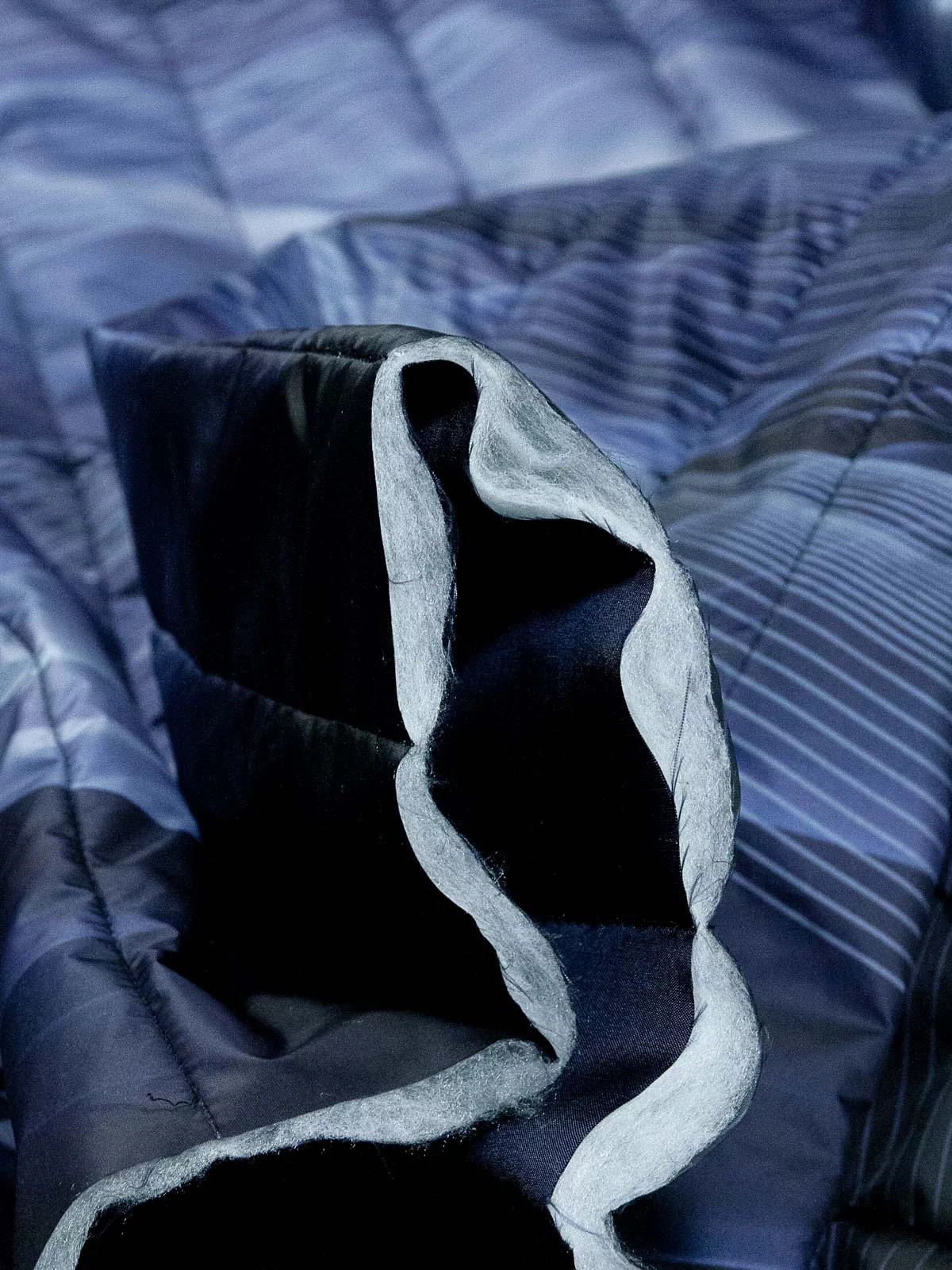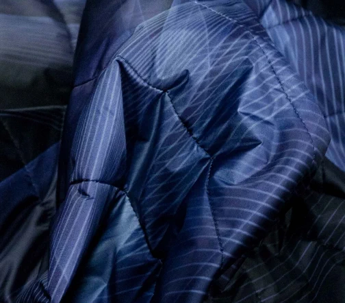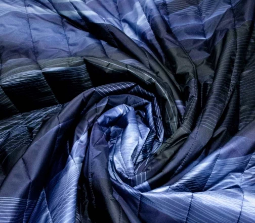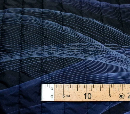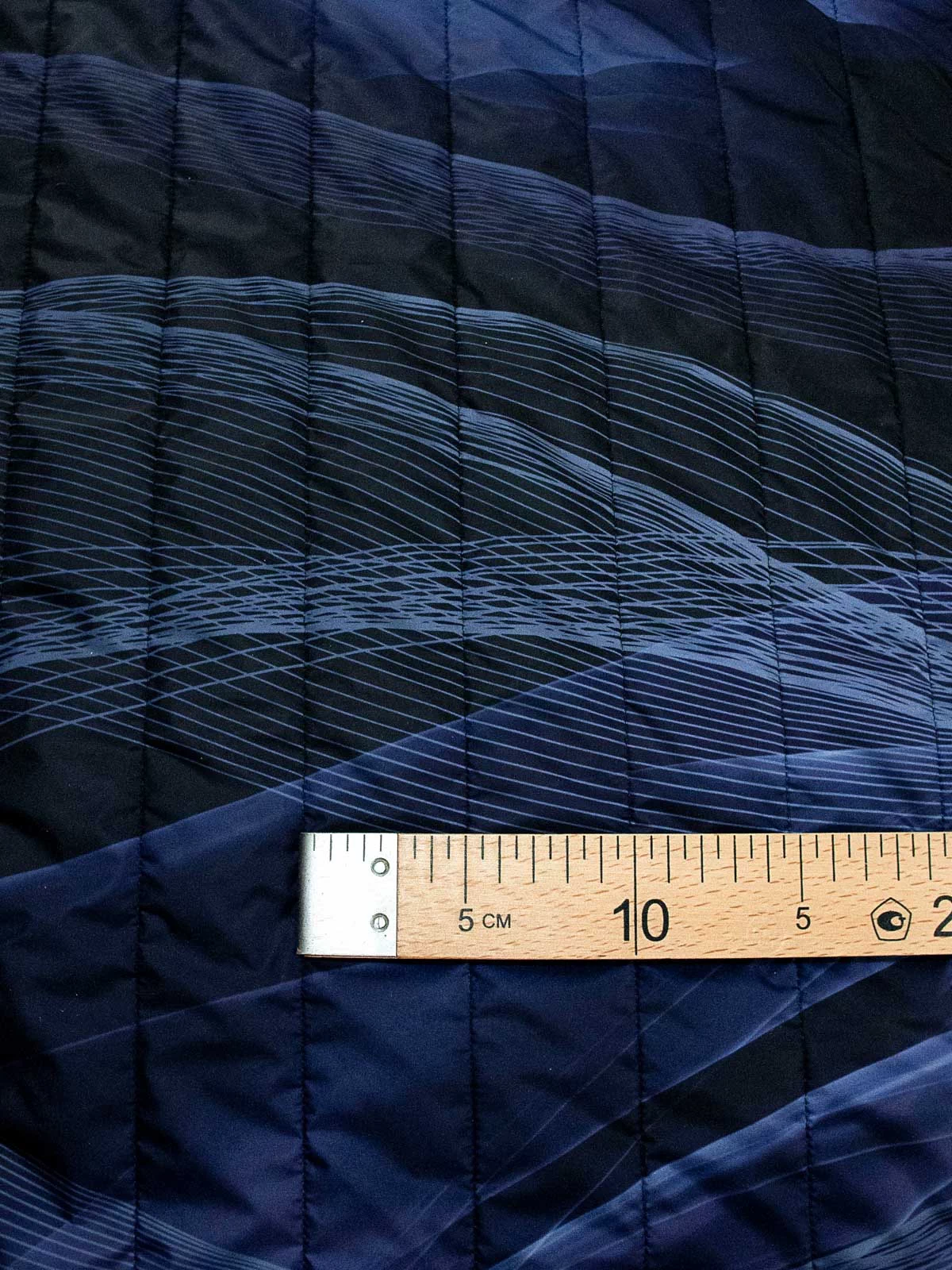 Стеганая трехслойная курточная ткань на синтепоне и подкладке. С лицевой стороны прочная матовая ткань с оригинальным абстрактным геометрическим рисунком поперёк кромке в сине-фиолетовой гамме на черном фоне, с изнаночной - подкладочная ткань вискоза темно-синего цвета. Стежка параллельно кромке. Ширина стежки 5,0см.