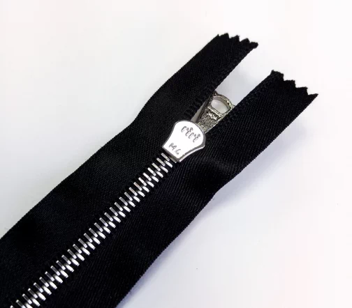 Молния металл, ширина цепи 4 мм, тесьма полиэстеровая черного цвета, цвет металла никель, однозамковая неразъемная, длина 18 см.