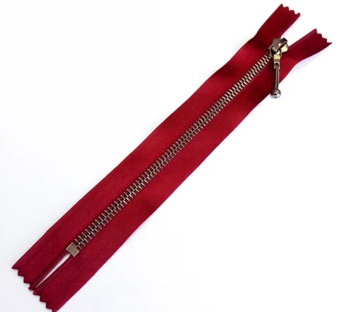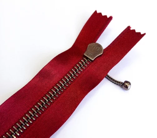 Молния металл, ширина цепи 6 мм, тесьма полиэстровая винного цвета, цвет металла темный никель, однозамковая неразъемная, длина 18 см.