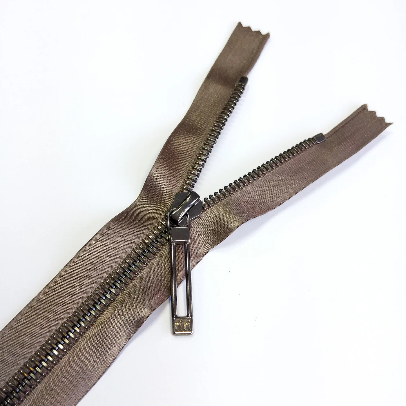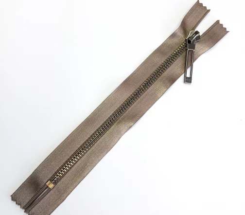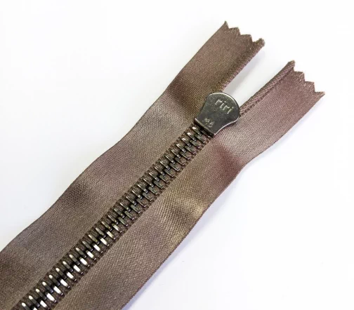 Молния металл, ширина цепи 6 мм, тесьма полиэстер бежево-коричневого цвета, цвет металла темный никель, однозамковая неразъемная, длина 18 см.