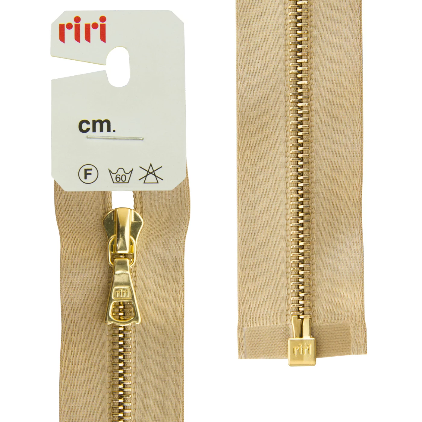 Молния RiRi атласная, металл, разъём, 1замок 4мм 65см, подв.Flach, цепь GO, цвет 2213, золотисто-беж