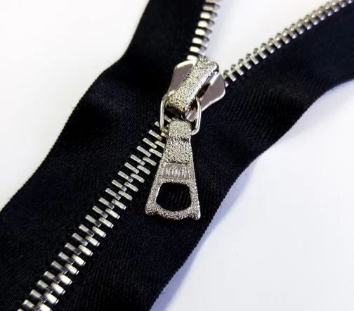 Молния металл, ширина цепи 4 мм, тесьма полиэстеровая черного цвета, цвет металла никель, двухзамковая разъемная, длина 90 см.