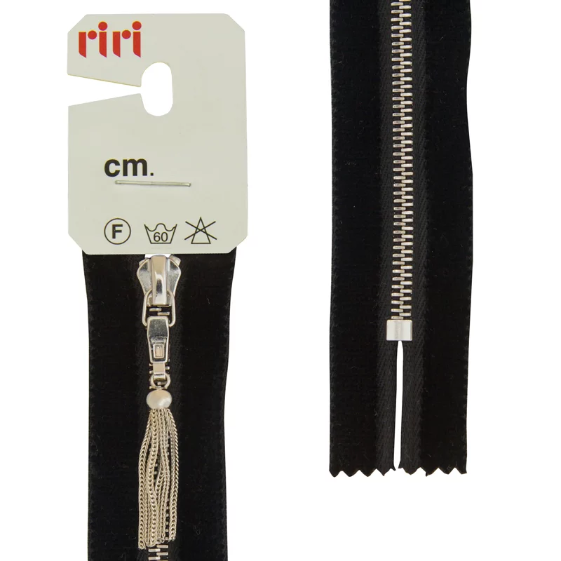 Бархатная молния RIRI черного цвета – отличный вариант для дизайнеров, производств, ателье по пошиву и ремонту одежды, обуви и сумок. Бархатную молнию часто используют на куртках, платьях, юбках и т.д.