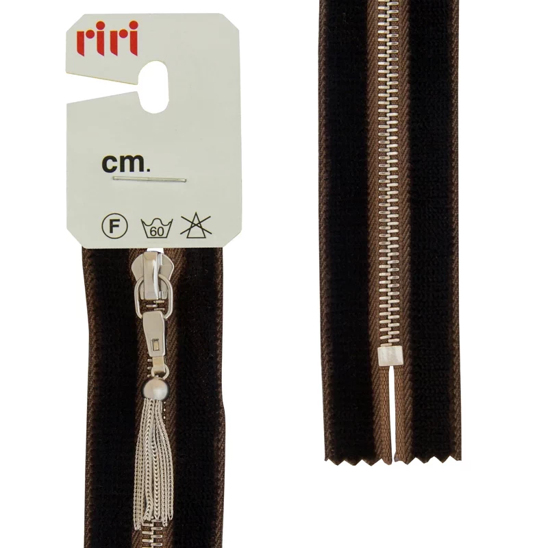 Бархатная молния RIRI коричневого цвета – отличный вариант для дизайнеров, производств, ателье по пошиву и ремонту одежды, обуви и сумок. Бархатную молнию часто используют на куртках, платьях, юбках и т.д.