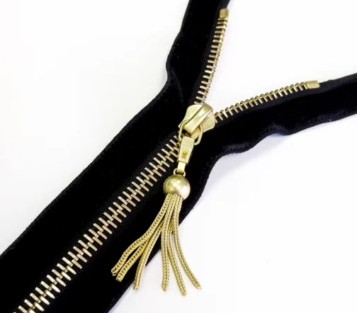 Молния металл, ширина цепи 6 мм, тесьма бархатная черного цвета, цвет металла золото, однозамковая разъемная, длина 70 см.