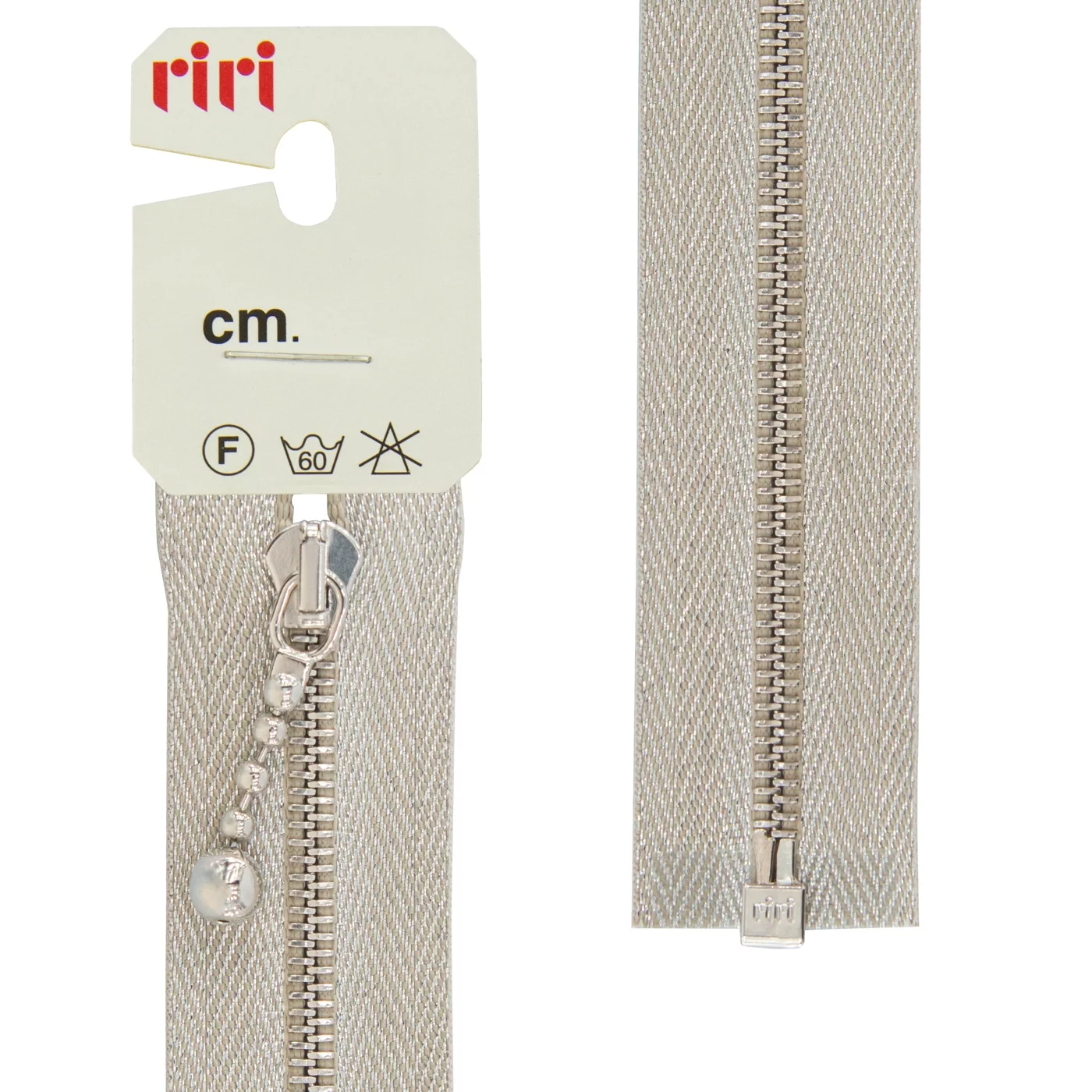Звено и бегунок имеют цвет серебристого никелированного покрытия, нанесённого гальваническим способом. Тесьма содержит блестящую люрексовую нить. Бегунок riri представляет собой монотело, сопротивление разрыву замка и подвески на замке в 2 раза больше, чем на аналогичных изделиях других производителей!