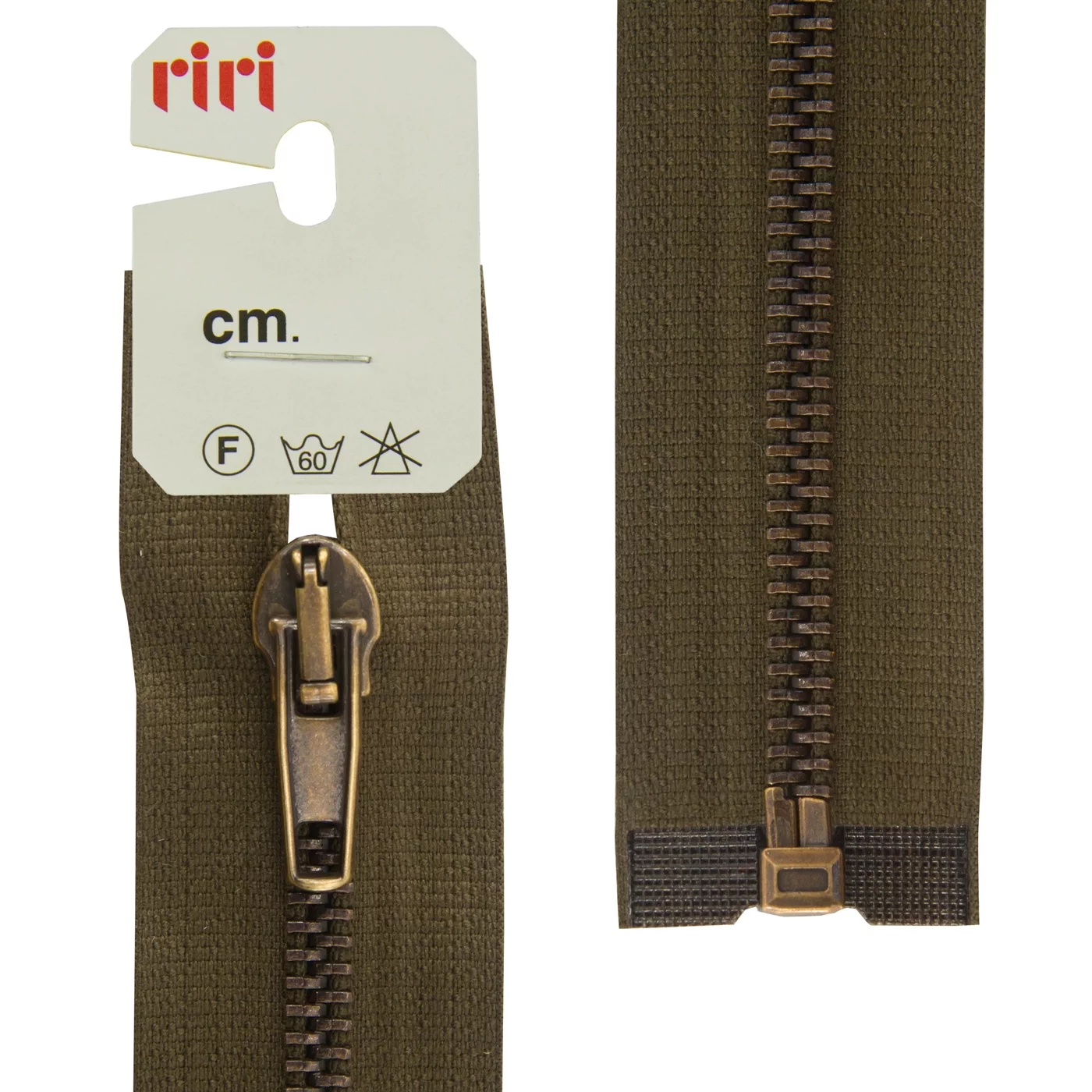 Молния RiRi металл разъём, 1 замок 5 мм 70 см, подвеска АТ, цепь антик медь, цвет 2817, темный хаки