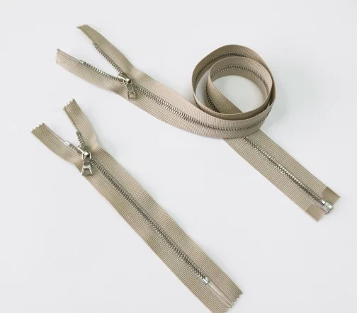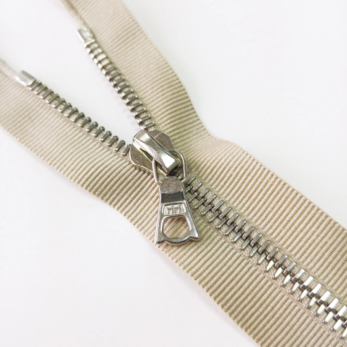 Молния металл, ширина цепи 6 мм, тесьма репс бежевого цвета, цвет металла никель, однозамковая неразъемная, длина 18 см.
