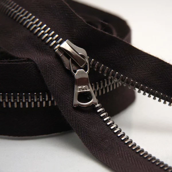 Молния металл, цепь 6 мм, тесьма полиэстер коричневого цвета, цвет металла темный никель, однозамковая неразъемная 18 см.