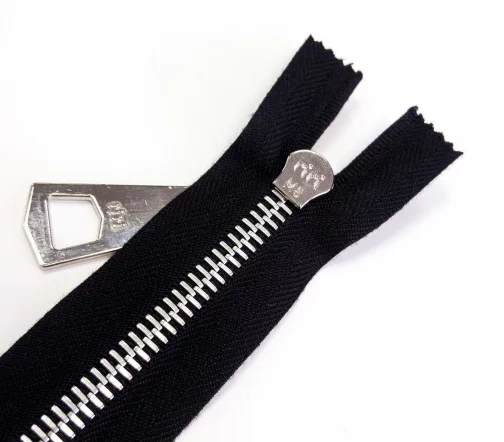 Молния металл, ширина цепи 8 мм, тесьма полиэстровая черного цвета, цвет металла никель, однозамковая разъемная, длина 70 см.