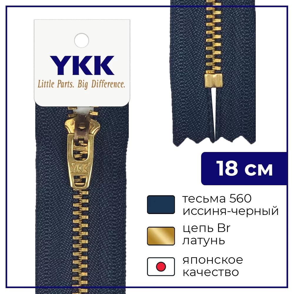 Молния YKK металл неразъёмная, 1 замок 18см тип 3, цепь латунь, цвет 560, иссиня-черный