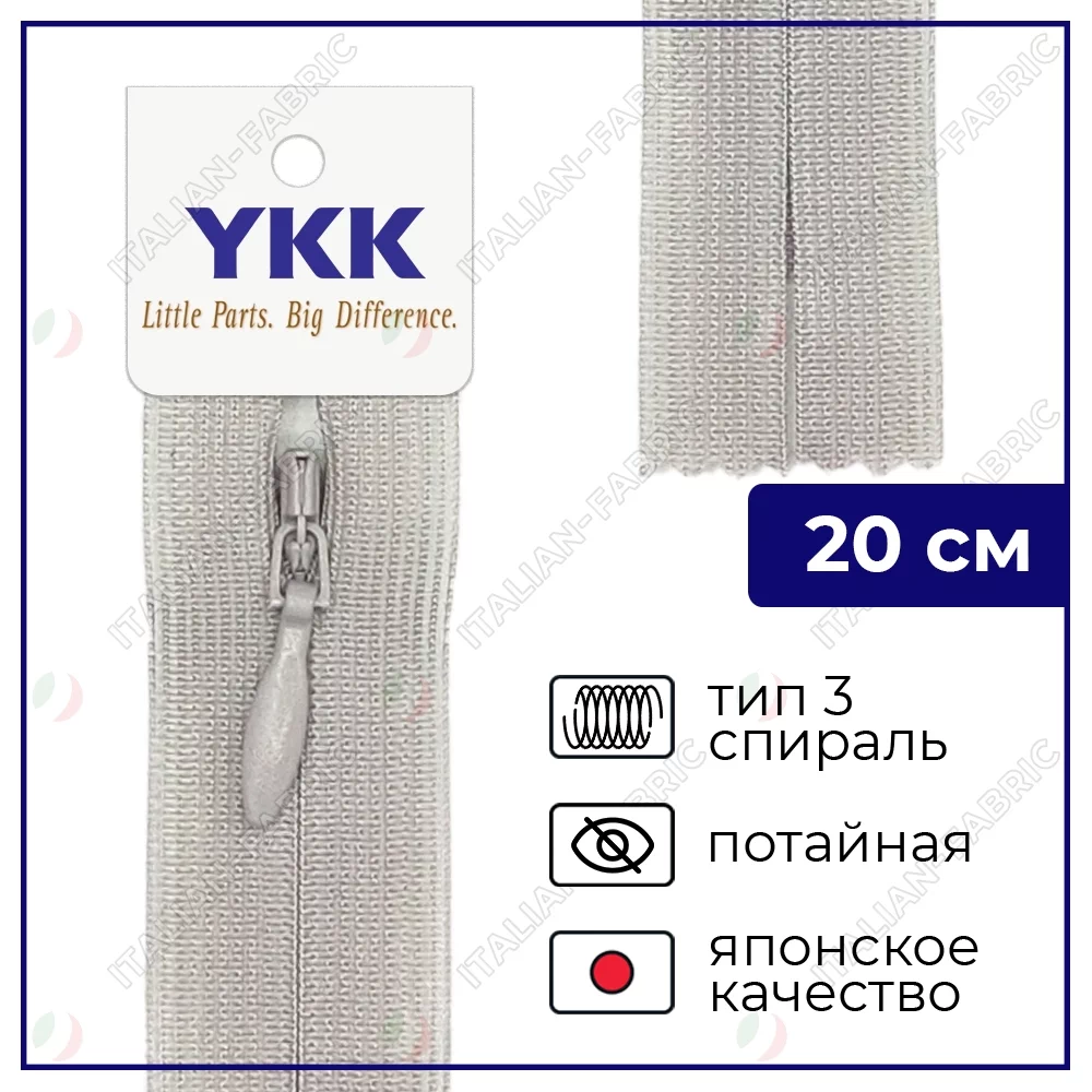 Молния YKK потайная неразъёмная, 20см, 3мм, цвет 032, серый крем