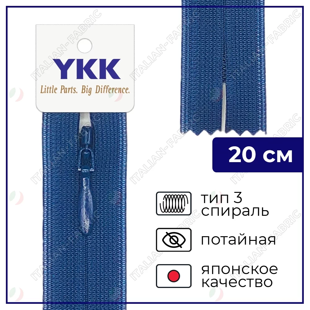 Молния YKK потайная неразъёмная, 20см, 3мм, цвет 040, синий