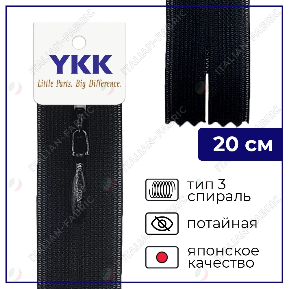 Молния YKK потайная неразъёмная, 20см, 3мм, цвет 580, черный