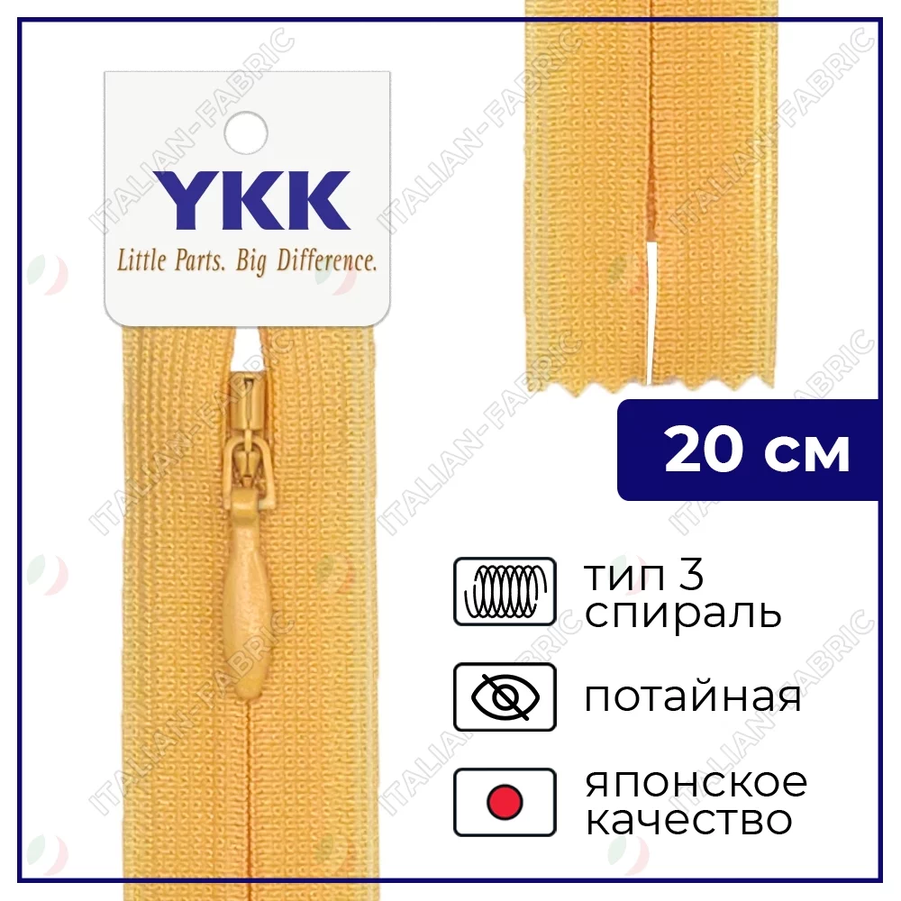 Молния YKK потайная неразъёмная, 20см, 3мм, цвет 843, темно-желтый