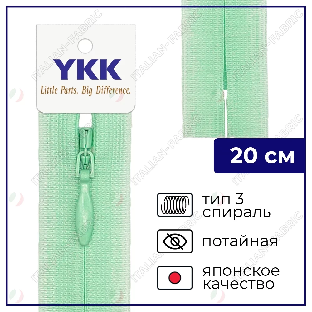 Молния YKK потайная неразъёмная, 20см, 3мм, цвет 871, пастельный зеленый