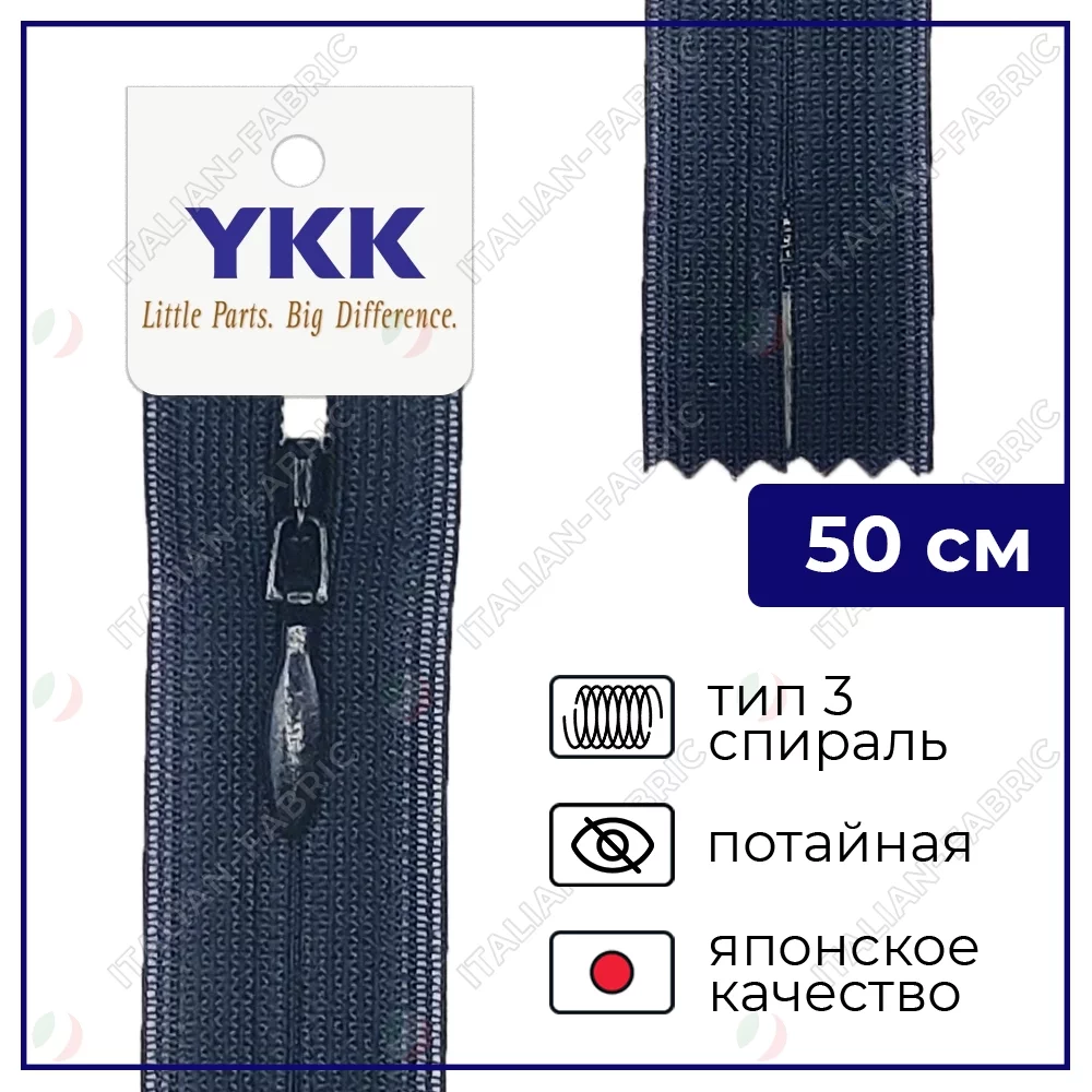 Молния YKK потайная неразъёмная, 50см, 3мм, цвет 233, черно-синий
