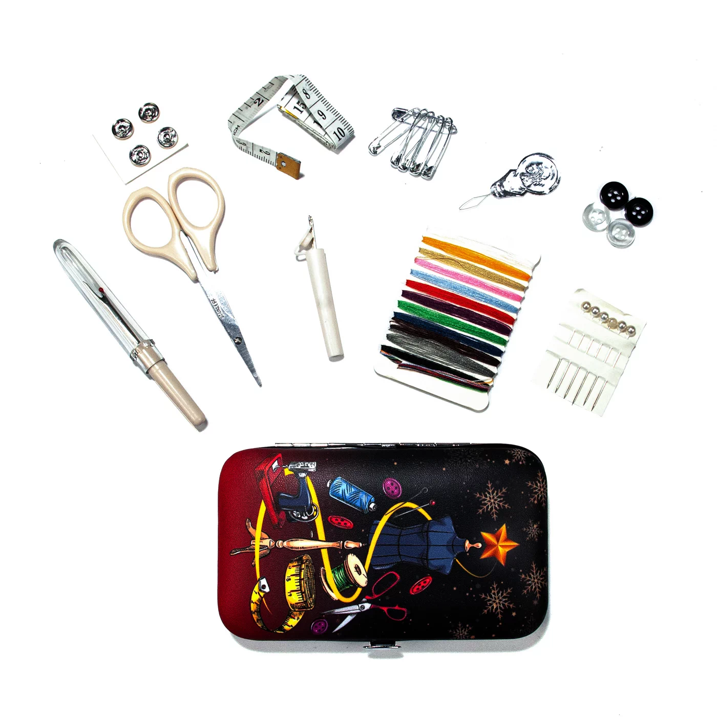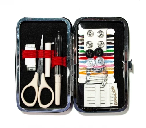 Швейный набор в футляре из искусственной кожи. Размер изделия - 12*7*2 см. Отлично подходит для путешествий и повседневного использования.
