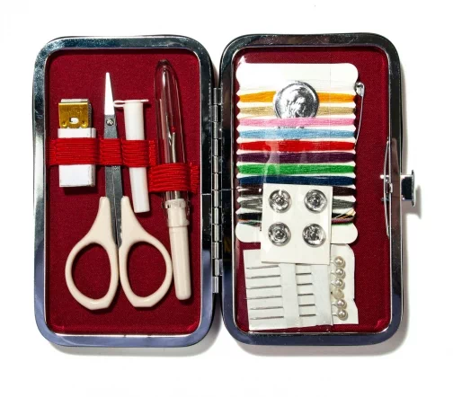 Швейный набор в футляре из искусственной кожи. Размер изделия - 12*7*2 см. Отлично подходит для путешествий и повседневного использования.