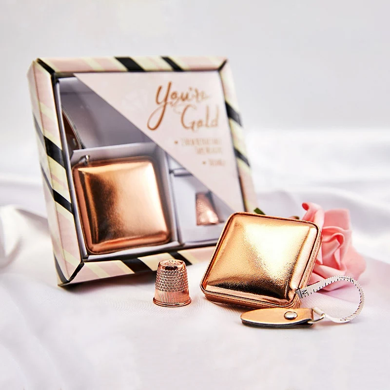 Подарочный набор сантиметр-рулетка и наперсток, цвет розовое золото. Выдвижная рулетка 150 см/ 60 дюймов. Металлический наперсток премиум-класса. Набор представлен в подарочной картонной коробке. Идеальный подарок на День матери, Рождество и т.д. Размеры изделия: 12 х 12 х 2,5 см.