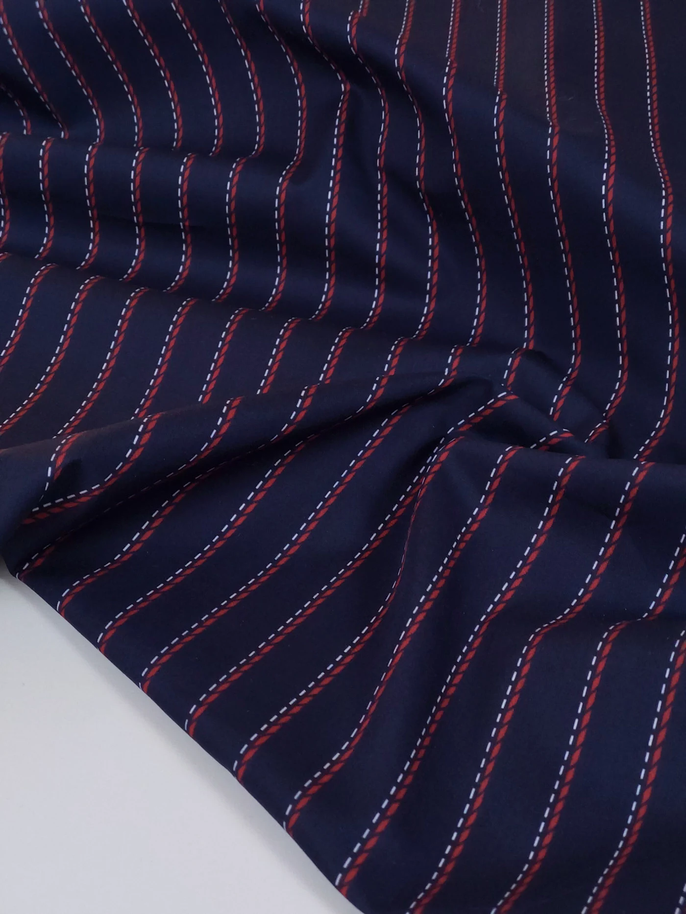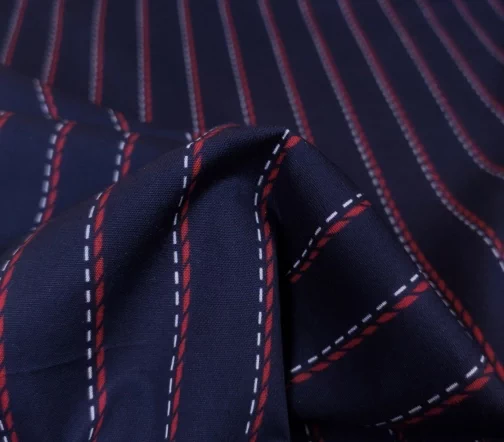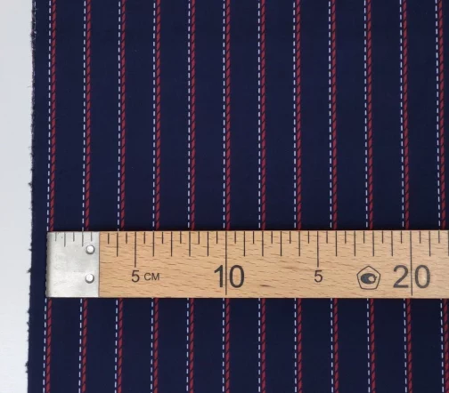 Хлопок темно-синего цвета с узором в виде красных сплошных и белых пунктирных полосок.