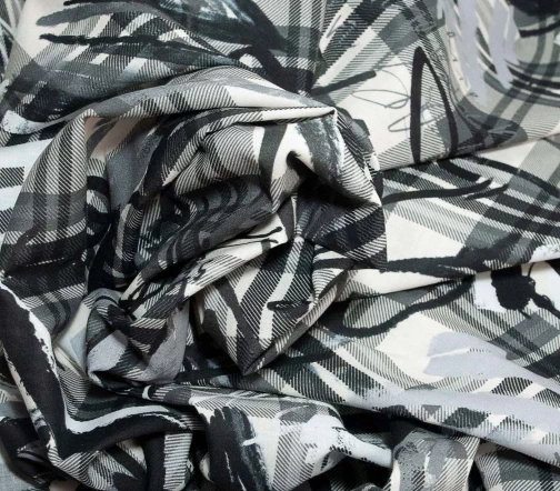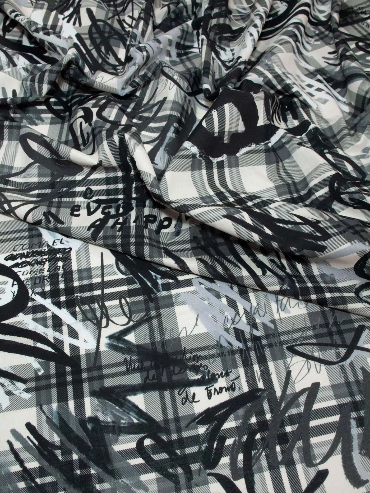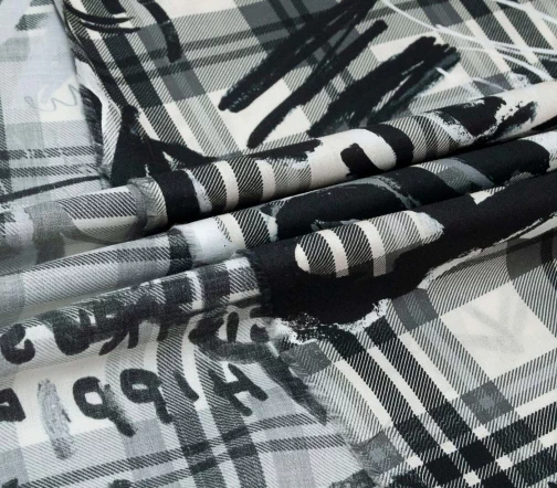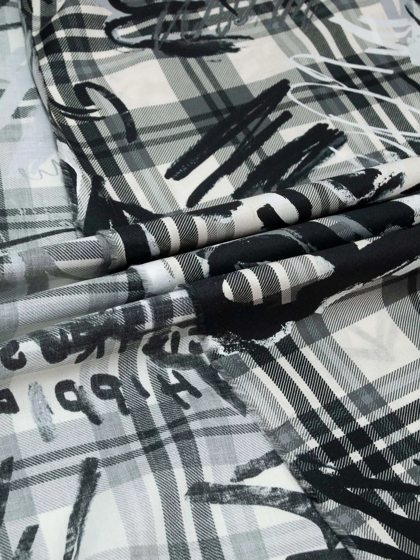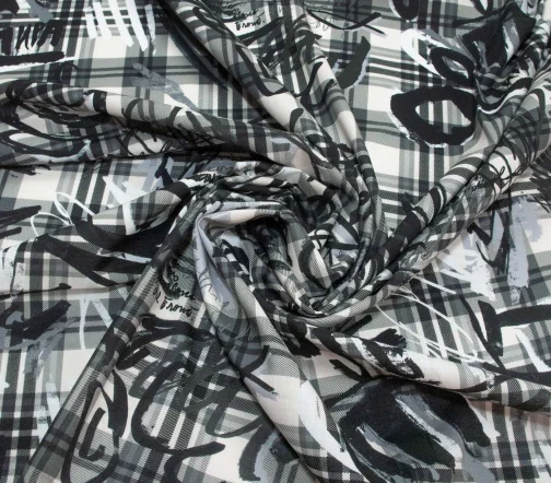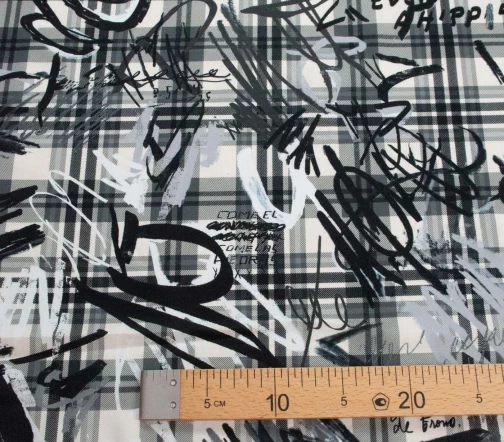 Изумительный тонкий хлопок для шикарного платья или рубашки. Оригинальный клетчатый рисунок с граффити в серых тонах.