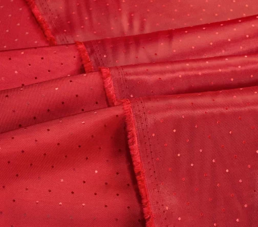 Подкладочная ткань с высоким содержанием вискозы, легким блеском и жаккардовым мотивом в точку (размер 1,5 мм) в красном цвете. Достаточно скользящая, прочная и пластичная, украсит собой элегантный жакет, куртку или легкое пальто.