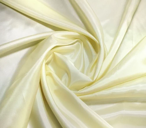 Тонкая ткань светло-желтого цвета из вискозы с легким блеском. Просвечивает средне, скользит, является прочной и пластичной. Такая подкладка достаточно универсальна и подойдет для создания как жакета или куртки, так и юбки или платья.