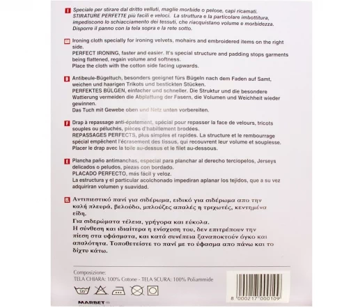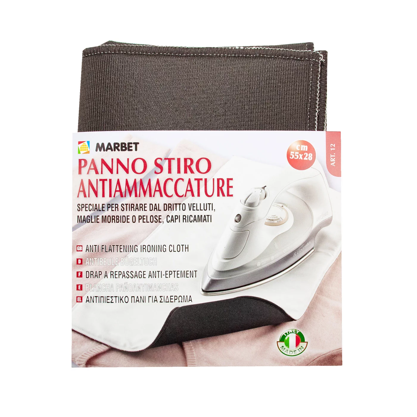 Специально разработанный материал (сверху - хлопок, снизу - губчатая ткань) амортизирует вес утюга, позволяя гладить с лицевой стороны изделия из бархата, мохера и вышивку.