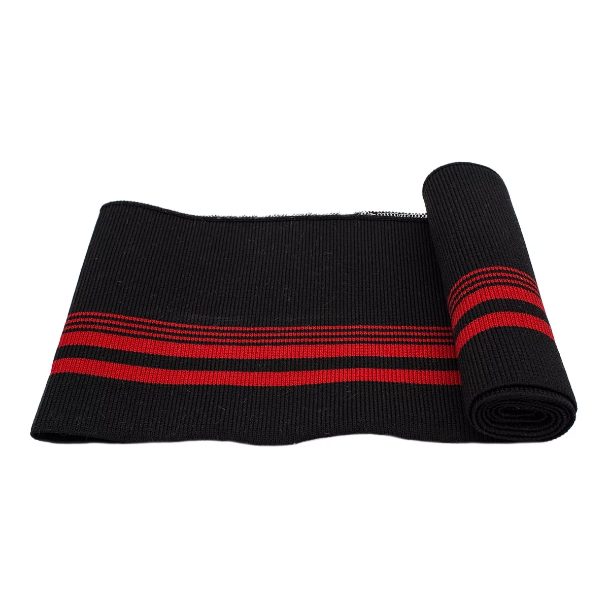 Трикотажный подвяз с контрасными полосами. Подвязы используются при шитье спортивной одежды, одежды для дома и отдыха. Подходят также для замены изношенных деталей: резинок на манжетах и нижней кромке свитера, куртки, толстовки, на поясе брюк и др. Изготовлен из синтетических материалов – полиэстера и спандекса. Полиэстер быстро высыхает, устойчив к износу и не требует использования особых моющих средств. Волокна спандекса придают изделию эластичность – способность растягиваться и при этом сохранять форму. Размеры ленты: ширина 14 см, длина 80 см.