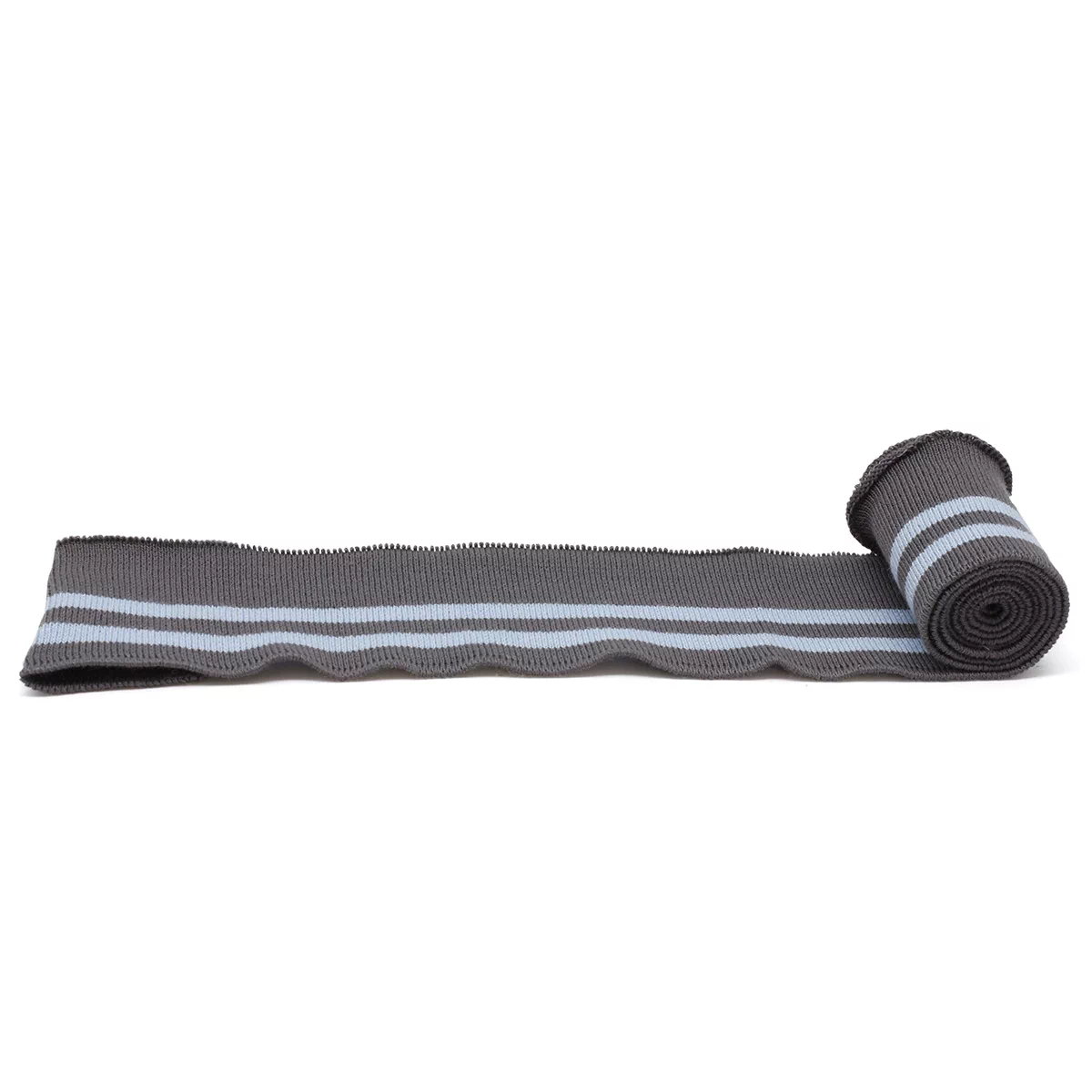 Трикотажный подвяз с контрасными полосами. Подвязы используются при шитье спортивной одежды, одежды для дома и отдыха. Подходят также для замены изношенных деталей: резинок на манжетах и нижней кромке свитера, куртки, толстовки, на поясе брюк и др. Изготовлен из 100% полиэстера. Это синтетическое волокно сохраняет форму и цвет длительное время, не дает усадки, не требует использования специальных моющих средств. Не требует дополнительной обработки перед пришиванием. Размер ленты: ширина 5 см, длина 80 см.